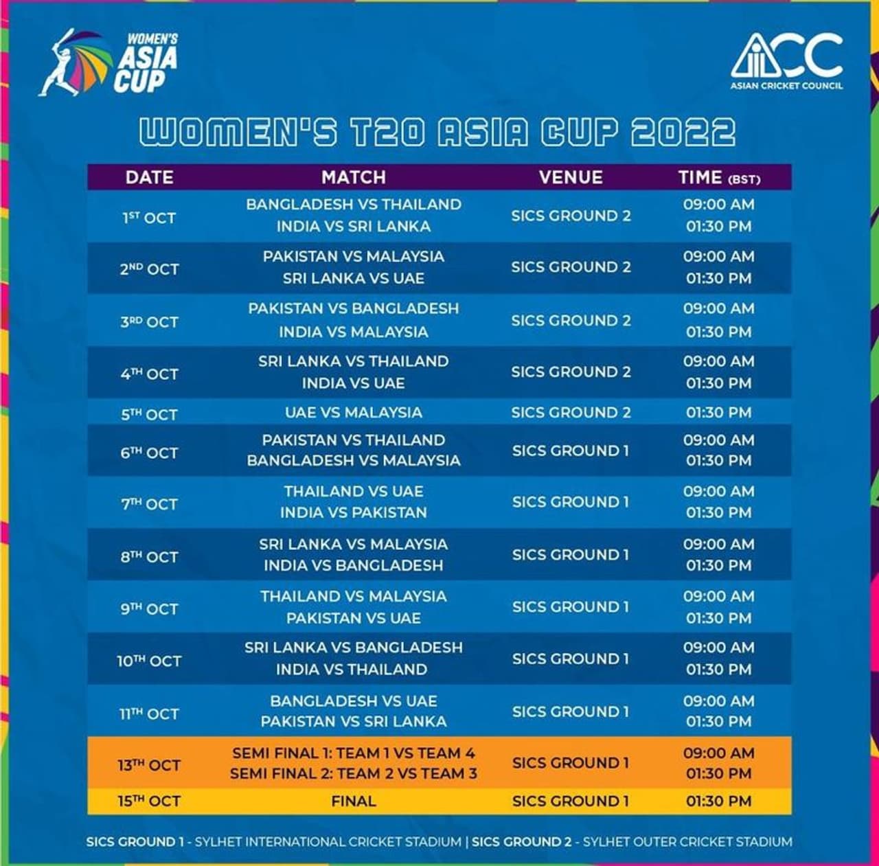एसीसी द्वारा जारी शेड्यूल के मुताबिक 1 अक्टूबर को टूर्नामेंट राबिन राउंड फार्मेट में आयोजित किया जाएगा। इस राउंट में टॉप की 4 टीमें सेमीफाइनल के लिए क्वालीफाई करेंगी। महिला एशिया कप टी20 क्रिकेट प्रतियोगिता 2022 में भारत, पाकिस्तान, श्रीलंका, बांग्लादेश, यूएई, थाईलैंड और मलेशिया की टीमें शिरकत करेंगी। अफगानिस्तान में पुरूष क्रिकेट टीम तो है लेकिन महिला क्रिकेट टीम नहीं है, इसलिए अफगानिस्तान इस टूर्नामेंट में शामिल नहीं होगी। इससे पहले एशिया कप महिला टी20 का आयोजन 2018 में किया गया। बांग्लादेश की टीम चैंपियन बनी थी। इस बार भी बांग्लादेश की टीम फेवरिट के तौर पर मैदान में उतरेगी।