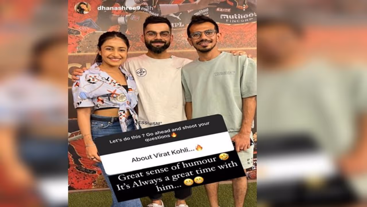 सवाल-जवाब सेशन के दौरान एक फैन ने धनाश्री से भारतीय क्रिकेट टीम के कप्तान विराट (Virat Kohli) के बारे में पूछा। अपने जवाब में, युजवेंद्र की पत्नी ने भारतीय कोहली की तारीफ की और लिखा, 'बेहतरीन सेंस ऑफ ह्यूमर। उनके साथ हमेशा अच्छा समय बीतता है।' इसके साथ, उन्होंने विराट, युजवेंद्र और खुद की एक थ्रोबैक फोटो भी शेयर की।