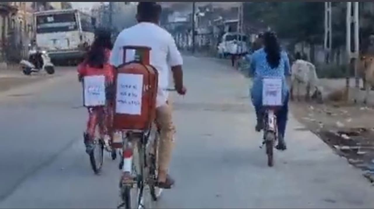 अमरेली के कांग्रेस प्रत्याशी परेश धनानी साइकिल से वोट देने पहुंचे। मगर उनके साथ एक दिलचस्प वाकया और था। उन्होंने साइकिल के करियर पर इस बार गैस सिलेंडर भी बांधा हुआ था, जबकि नामांकन करने वे साइकिल से गए थे वो भी पत्नी के साथ। मगर इस बार उन्होंने पत्नी को नहीं बल्कि, गैस सिलेंडर को पीछे लिया हुआ था। परेश धनानी अमरेली जिले से कांग्रेस के टिकट पर दो बार से विधायक हैं। पार्टी ने इस बार भी उन पर भरोसा जताया है।