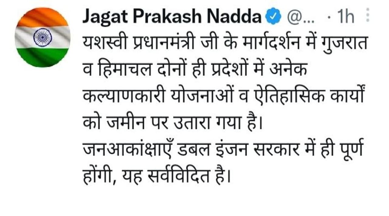 Gujarat Assembly Election 2022: गुजरात विधानसभा चुनाव की तारीख का ऐलान होते ही भाजपा अध्यक्ष जेपी नड्डा ने सोशल मीडिया पर ट्वीट किया। उन्होंने दावा किया कि राज्य में एक बार फिर भारतीय जनता पार्टी सरकार बनाने जा रही है।