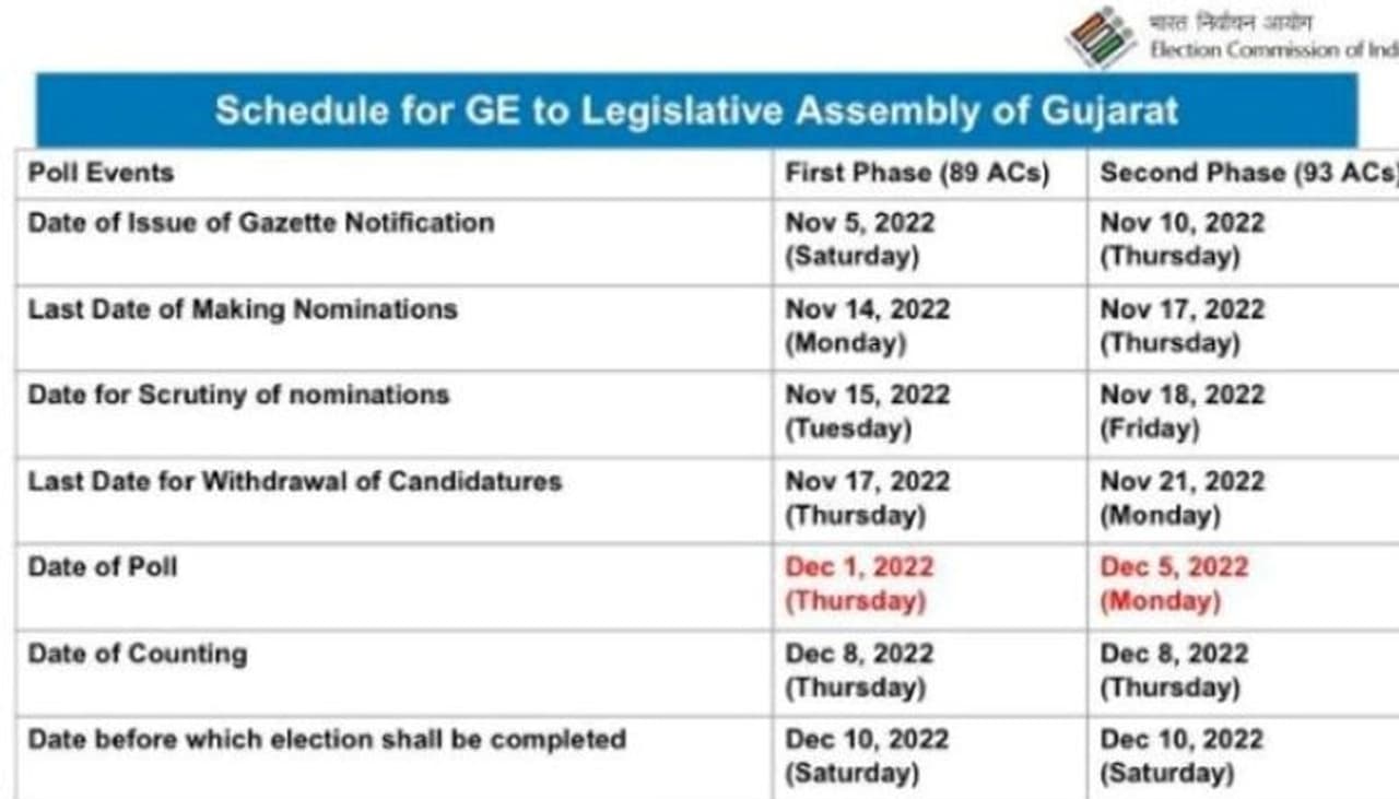 गुजरात विधानसभा चुनाव में इस बार पहले चरण की वोटिंग प्रॉसेस के लिए गजट नोटिफिकेशन 5 नवंबर को और दूसरे चरण की वोटिंग प्रक्रिया के लिए 10 नवंबर को जारी होगा। पहले चरण के लिए नामांकन प्रक्रिया 14 नवंबर अंतिम तारीख होगी, जबकि दूसरे चरण के लिए नामाकंन प्रक्रिया की अंतिम तारीख 17 नवंबर होगी। स्क्रूटनी पहले चरण के लिए 15 नवंबर को होगी, जबकि दूसरे चरण के लिए 18 नवंबर की तारीख तय है। नाम वापसी की अंतिम तारीख पहले चरण के लिए 17 नवंबर और दूसरे चरण के लिए 21 नवंबर निर्धारित की गई है। राज्य में पहले चरण की वोटिंग 1 दिसंबर को होगी, जबकि दूसरे चरण की वोटिंग 5 दिसंबर (Gujrat Vidhansabha Chunav kitni tarikih ko hai) को होगी। वहीं, मतगणना दोनों चरणों की 8 दिसंबर को होगी और संभवत: उसी दिन देर रात तक अंतिम परिणाम जारी हो जाएंगे।