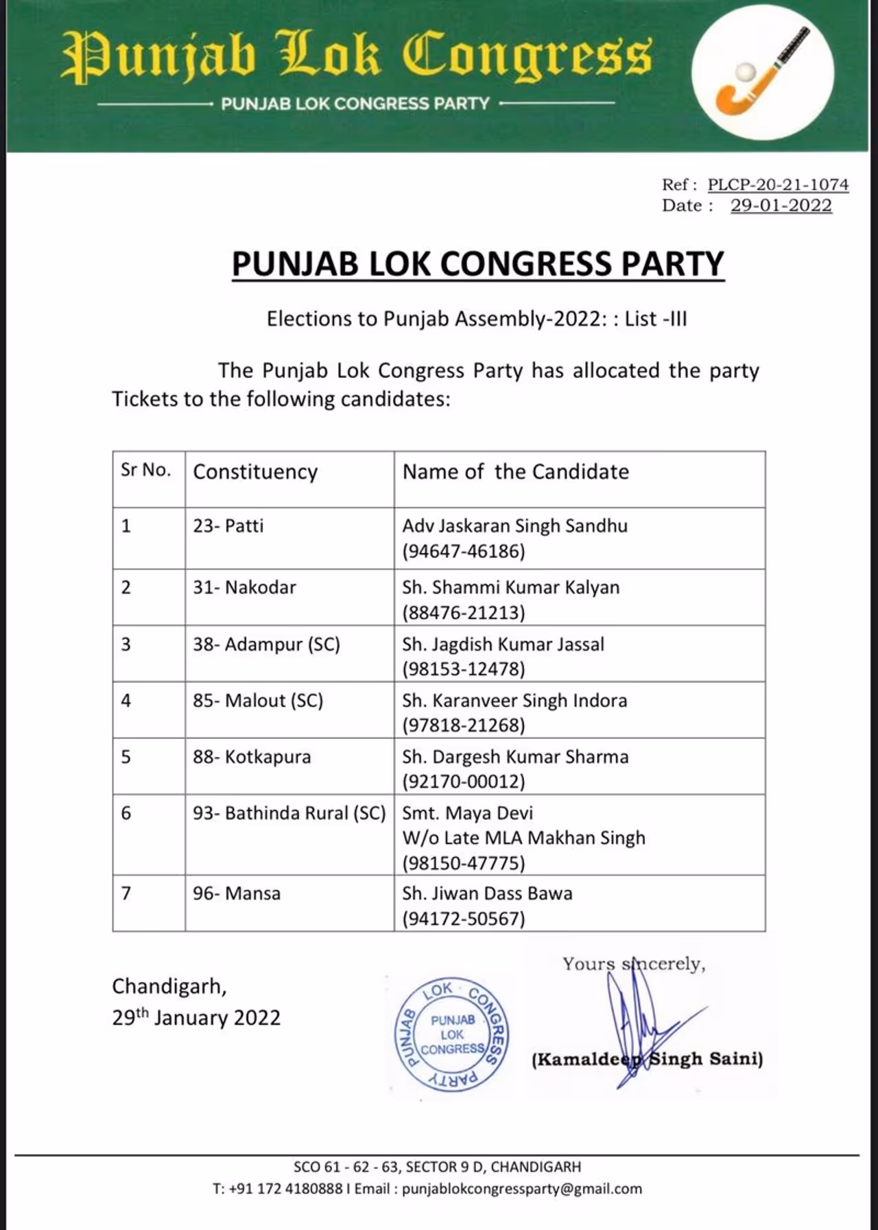 चंडीगढ़। कैप्टन अमरिंदर सिंह (Captain Amarinder Singh) की पार्टी पंजाब लोक कांग्रेस (Punjab Lok Congress) ने उम्मीदवारों की तीसरी लिस्ट जारी कर दी है। इसमें 7 कंडीडेट के नाम हैं। इससे पहले कैप्टन ने दूसरी सूची में 5 और पहली सूची में 22 उम्मीदवार घोषित किए थे। कैप्टन अब तक 34 उम्मीदवारों का ऐलान कर चुके हैं। अभी 2 उम्मीदवारों का ऐलान बाकी है। एनडीए गठबंधन में कैप्टन की पार्टी को 36 सीटें मिली हैं।