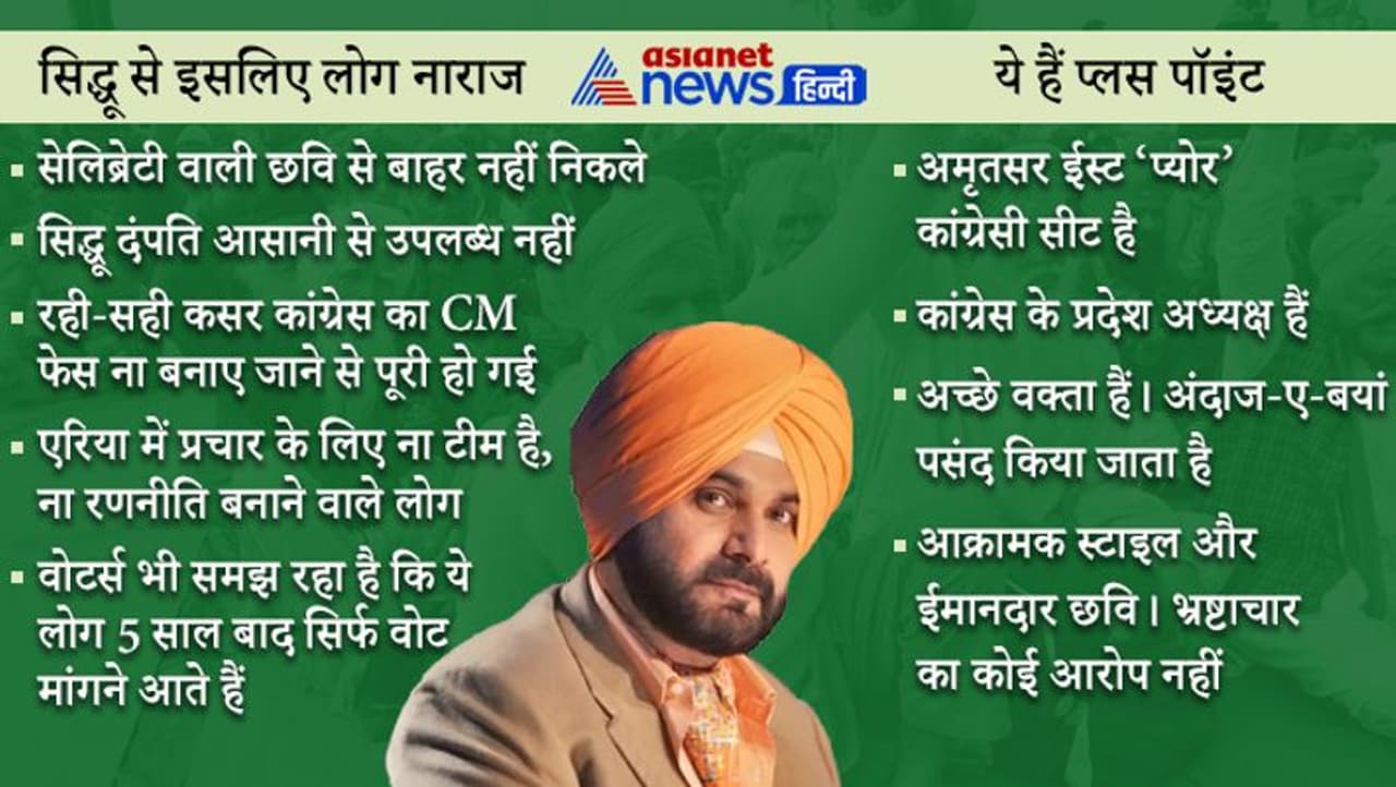 दरअसल, 18 साल से सियासत कर रहे सिद्धू को कभी कड़ी टक्कर नहीं मिली, मगर इस बार वोटिंग से 10 दिन पहले तक सिद्धू बुरी तरह फंसे नजर आ रहे हैं। रही-सही कसर आम आदमी पार्टी (AAP) पूरी कर रही है। AAP कैंडीडेट जीवनजोत कौर बेशक बहुत बड़ा नाम ना हों, मगर लोग झाड़ू को पसंद कर रहे हैं। इनके बीच, BJP ने अकाली दल से अलग होने के बाद अमृतसर ईस्ट सीट पर उपस्थिति दर्ज कराने के मकसद से रिटायर्ड IAS अफसर जगमोहन राजू पर दांव खेला है। यह सभी मिलकर सिद्धू के वोट काट रहे हैं जिससे उनकी परेशानियां बढ़ रही हैं।