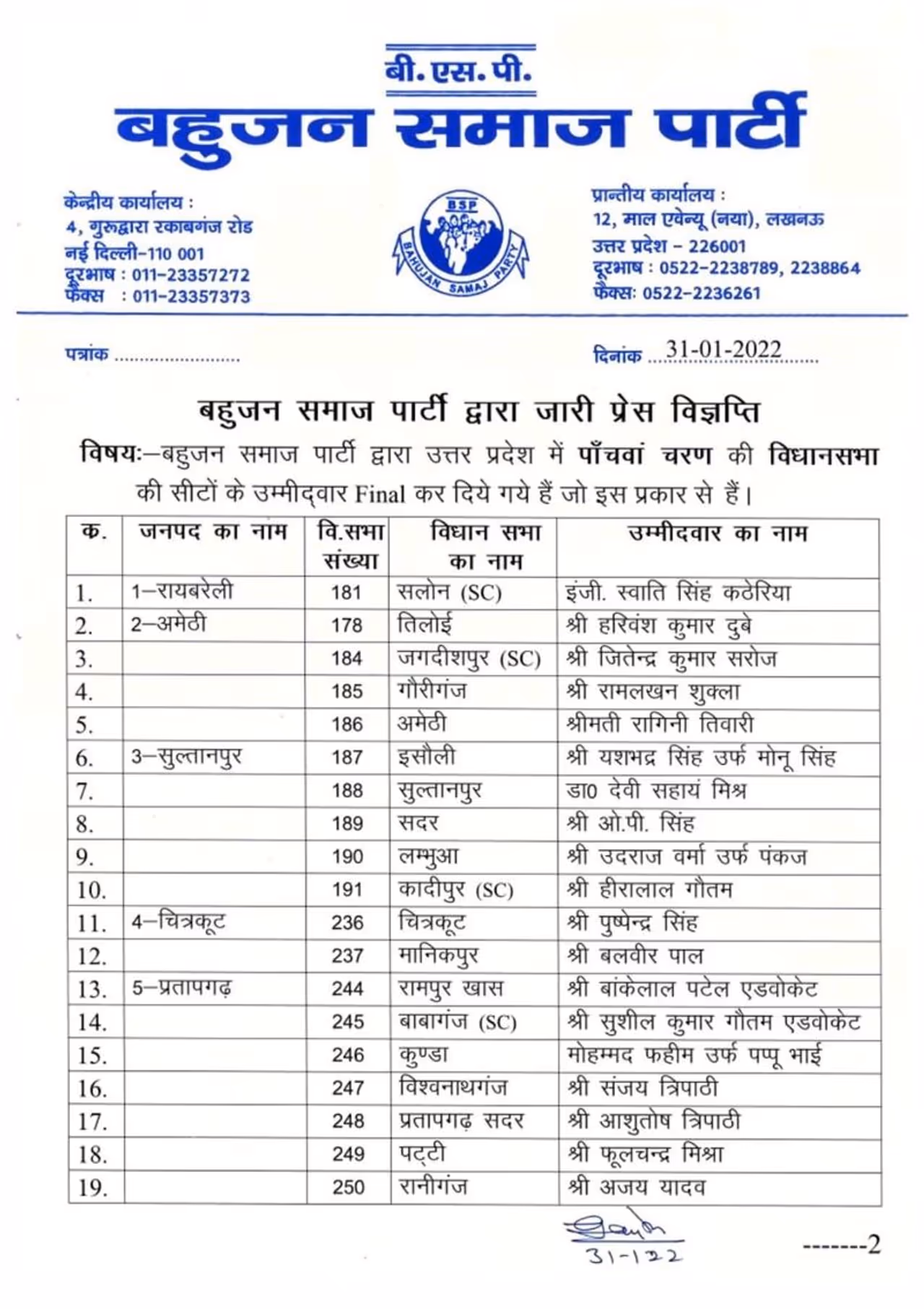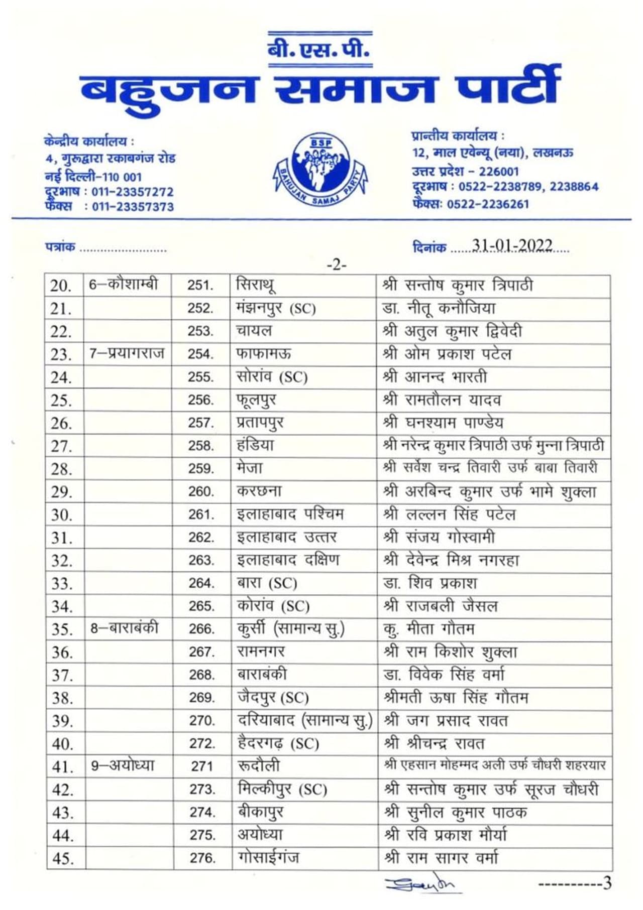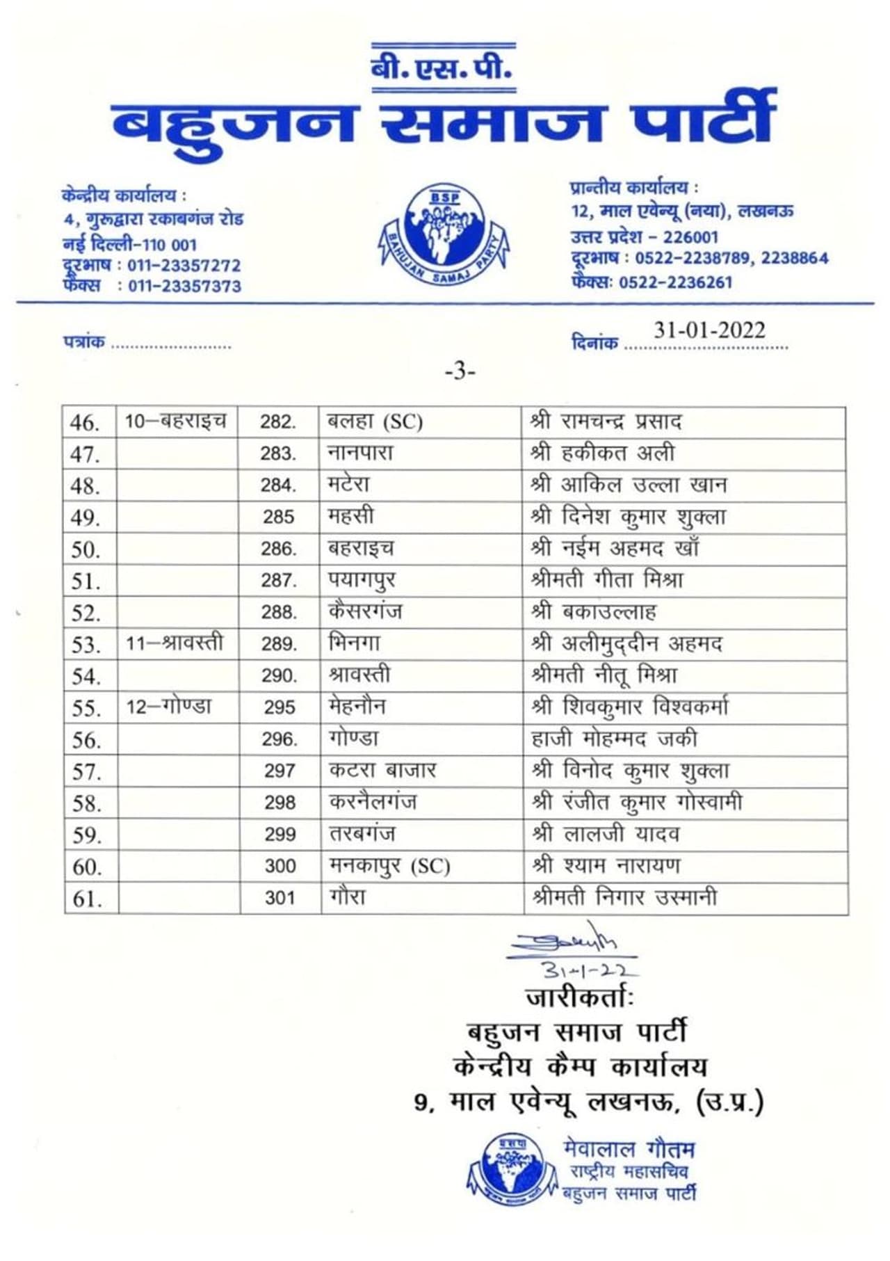 भिनगा से निवर्तमान विधायक असलम अली राइनी बसपा छोड़ सपा में चले गए थे। इस सीट पर अलीमुद्दीन अहमद को उतारा गया है। बाराबंकी की दरियाबाद व कुर्सी अनारक्षित सीट पर दलित उम्मीदवारों को मौका दिया गया है। गोंडा में भाजपा के बागी विनोद कुमार शुक्ला को कटरा बाजार से प्रत्याशी बनाया गया है। सुल्तानपुर के इसौली से यशभद्र सिंह उर्फ मोनू सिंह व सदर से ओपी सिंह को टिकट दिया गया है।