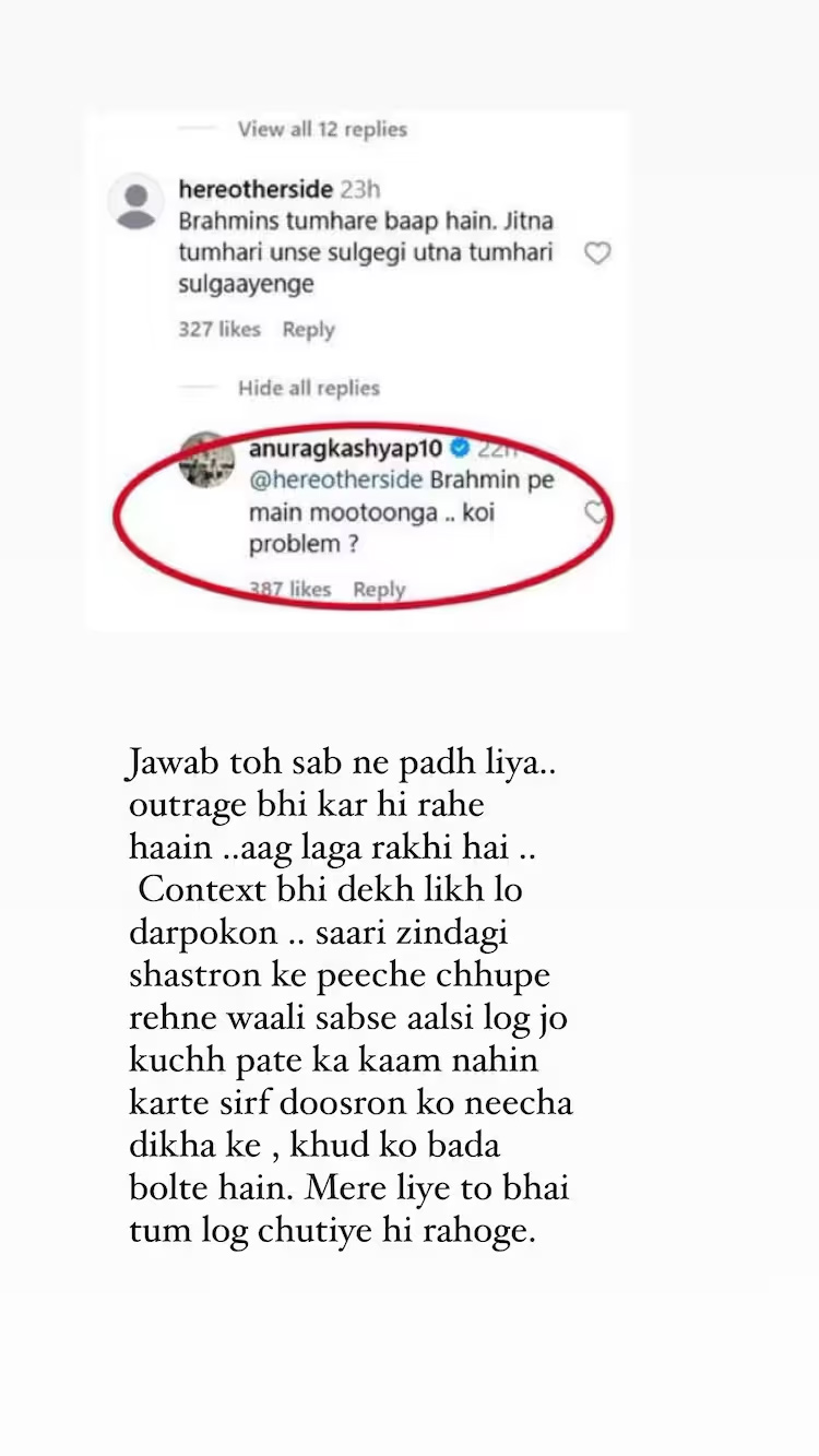इसी पोस्ट पर एक इंटरनेट यूजर ने कमेंट बॉक्स में लिखा, "ब्राह्मण तुम्हारे बाप हैं। जितना तुम्हारी उनसे सुलगेगी, उतना सुलगाएंगे।" इसी कमेंट पर रिप्लाई देते हुए अनुराग ने लिखा था, "ब्राह्मण पे मैं मूतूंगा...कोई प्रॉब्लम?" अनुराग कश्यप का यही कमेंट इस कमेंट पर ब्राह्मण समाज ने हंगामा किया था। इस मामले में उनके खिलाफ मुंबई पुलिस में शिकायत भी दर्ज कराई गई और FIR की मांग की गई।