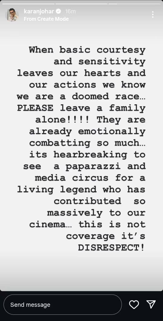 करन जौहर ने नाराजगी जताते हुए गुरुवार को अपनी पोस्ट में लिखा, "जब हमारे दिलों के अंदर और हमारे कामों से बुनियादी शिष्टाचार और संवेदनशीलता निकल जाती है तो हम एक बर्बाद नस्ल हैं। कृपया परिवार को अकेला छोड़ दें। वे पहले ही भावनात्मक रूप से बेहद संघर्ष कर रहे हैं। हमारे सिनेमा में इतना बड़ा योगदान देने वाले एक लिविंग लीजेंड के लिए पैपराजी और मीडिया का यह सर्कस देखकर दुख होता है। यह कवरेज नहीं है, यह अपमान है।"