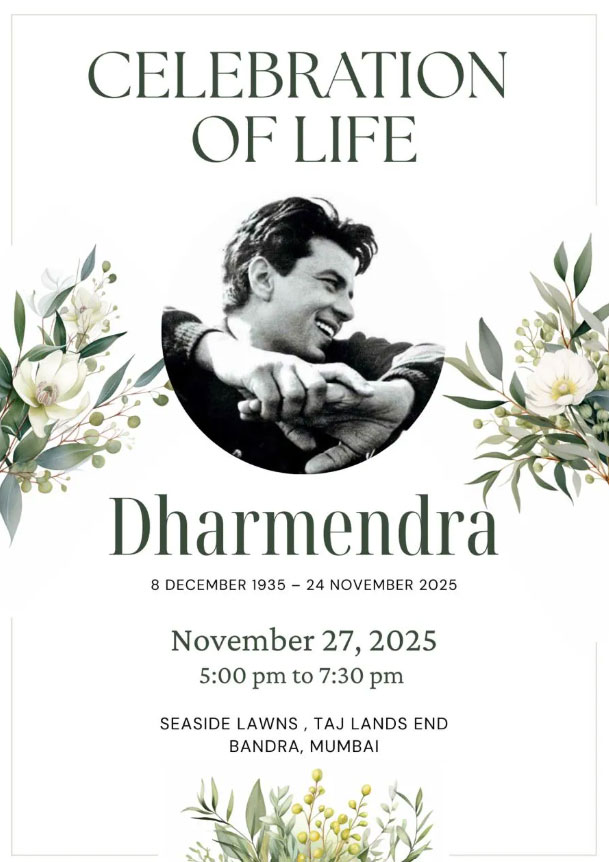 बॉलीवुड के दिग्गज सुपरस्टार धर्मेंद्र के निधन से सिर्फ उनका परिवार और करीबी ही नहीं, पूरी फिल्म इंडस्ट्री और उनके फैंस भी शोक में हैं। उनका गुपचुप अंतिम संस्कार के बाद अब देओल फैमिली ने उनके लिए श्रद्धांजलि सभा रखने का फैसला लिया है। सभी के मन में यह सवाल था कि धरम पाजी की प्रेयर मीट कब और कहां रखी जाएगी। इस खुलासा हो गया है। देओल फैमिली की ओर से धर्मेंद्र की श्रद्धांजलि सभा के लिए आमंत्रण भेज दिए हैं। उन्होंने इस मौके को सेलिब्रेशन ऑफ़ लाइफ नाम दिया है। धर्मेंद्र की प्रेयर मीट का इनविटेशन कार्ड सोशल मीडिया पर वायरल हो रहा है।