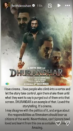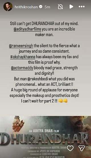 विवाद के बाद ऋतिक रोशन ने एक और इंस्टाग्राम स्टोरी शेयर की। इसमें उन्होंने फिल्म और इसके स्टार कास्ट और क्रू मेंबर्स की तारीफ़ की। उन्होंने लिखा, "धुरंधर अब भी मेरे दिमाग से नहीं जा रही है। आदित्य धर आप जबरदस्त फिल्ममेकर हैं। रणवीर सिंह शांत से लेकर तेजतर्रार होने तक आपका क्या सफ़र और क्या निरंतरता रही है। अक्षय खन्ना हमेशा से मेरे फेवरेट रहे हैं और यह फिल्म इसका सबूत है। आर. माधवन आप बहुत ही शानदार ग्रेस, स्ट्रेंथ और डिग्निटी लिए हुए हैं। लेकिन यार राकेश बेदी आपने जो किया है, वह जबरदस्त था। क्या एक्ट था...शानदार। सभी के लिए बहुत-बहुत तालियां। खासकर मेकअप और प्रोस्थेटिक्स डिपार्टमेंट के लिए। मुझे बेसब्री से पार्ट 2 का इंतजार है।"