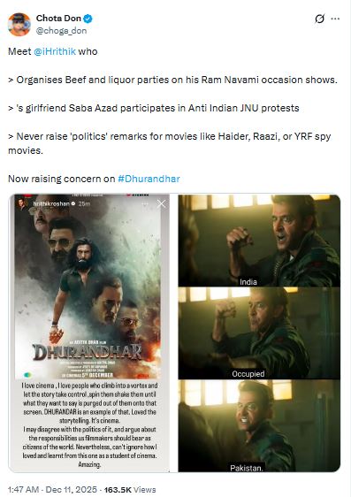 एक अन्य यूजर ने लिखा है, "ऋतिक से मिलिए, जो राम नवमी के मौके पर बीफ और शराब पार्टियां ऑर्गेनाइज करता है। जिसकी गर्लफ्रेंड सबा आजाद जेएनयू में भारत विरोधी प्रोटेस्ट में हिस्सा लेती है। 'हैदर', 'राजी' या YRF की स्पाय फिल्मों के लिए कभी भी पॉलिटिक्स वाली बातें नहीं करता। अब धुरंधर पर चिंता जता रहा है।"