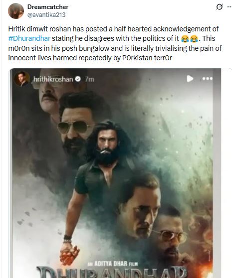 ऋतिक रोशन को उनकी पोस्ट को लेकर जमकर ट्रोल किया गया। मसलन, एक यूजर ने लिखा है, "ऋतिक बेवकूफ रोशन ने आधे-अधूरे मन से यह पोस्ट की है और कहा है कि वे धुरंधर की पॉलिटिक्स से सहमत नहीं हैं। यह बेवकूफ अपने आलीशान बंगले में बैठकर पाकिस्तानी आतंकवाद से बार-बार आतंक से नुकसान झेलने वाले बेगुनाह लोगों के दर्द को वाकई कम अंक रहा है।"