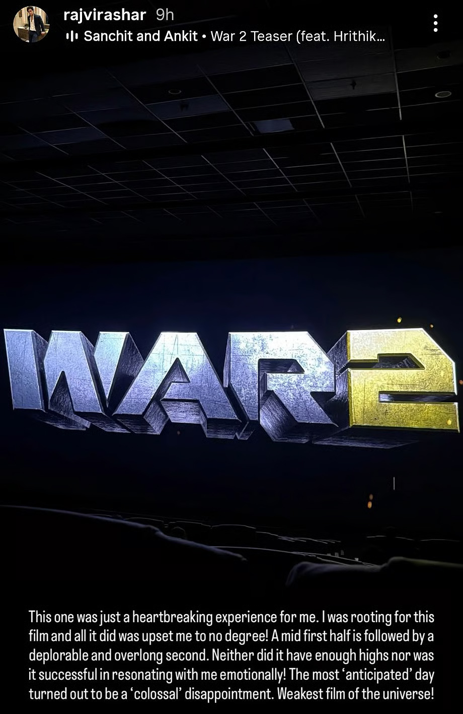 राजवीर अशर ने अपनी इंस्टाग्राम स्टोरी पर 'वॉर 2' का रिव्यू करते हुए लिखा है, "मेरे लिए यह दिल तोड़ने वाला अनुभव रहा। मैं इस फिल्म का बेसब्री से इंतज़ार कर रहा था और इसने मुझे इतना निराश कर दिया, जिसकी कोई हद नहीं है। फर्स्ट हाफ औसत दर्जे का है और सेकंड हाफ बेहद ही निराशाजनक और लंबा है। ना तो इसमें वो उत्साह है और ना ही यह इमोशनली रूप से मुझ पर असर डाल पाई है। जिस दिन का सबसे ज्यादा इंतज़ार था, वह भारी निराशा से भर गया। YRF स्पाय यूनिवर्स की सबसे कमज़ोर फिल्म।"
