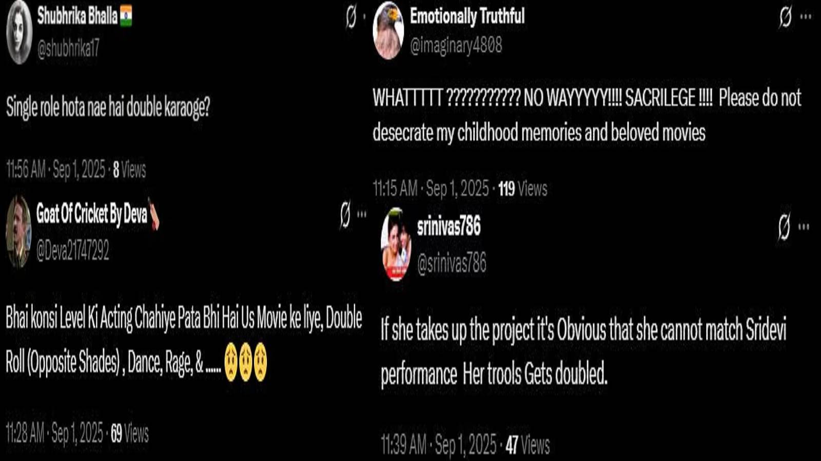 एक अन्य एक्स यूज़र ने लिखा, "सिंगल रोल तो हो नहीं पाता है डबल करोगे?" एक और नेटिजन ने ट्वीट किया, "अगर वह इस प्रोजेक्ट को हाथ में लेती हैं, तो एक्सपोज हो जाएंगी। वह कभी भी श्रीदेवी की बराबरी नहीं कर सकतीं।
