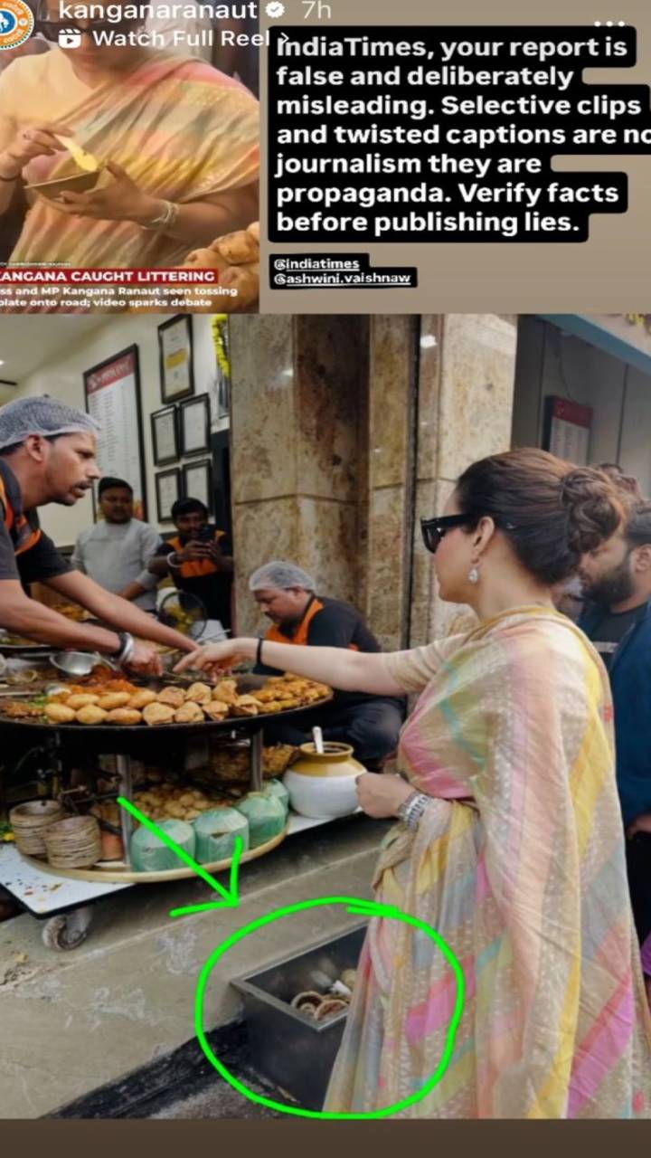 कंगना ने अपनी इंस्टाग्राम स्टोरीज़ पर टिकिया स्टॉल के पास एक अलग एंगल से ली गई अपनी एक तस्वीर शेयर की। उन्होंने तस्वीर के साथ एक ऐरो का निशान बनाकर दिखाया कि दुकान के ठीक बगल में एक कूड़ेदान रखा था, जहां इस्तेमाल की हुई कागज़ की प्लेटें रखी जाती थीं। कंगना ने बताया कि सच तो यह है कि उन्होंने भी अपनी प्लेट उसी कूड़ेदान में डाली थी। उन्होंने कैप्शन में लिखा, "झूठ फैलाने से पहले फैक्ट को कंफर्म कर लेना चाहिए।