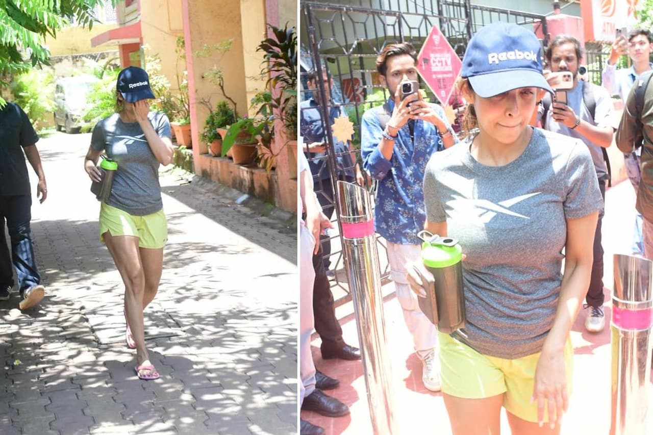 योगा क्लास के बाहर मलाइका अरोड़ा शॉर्ट्स, टी-शर्ट और कैप लगाए दिखीं। उनके हाथ में एक बोलत भी थी।