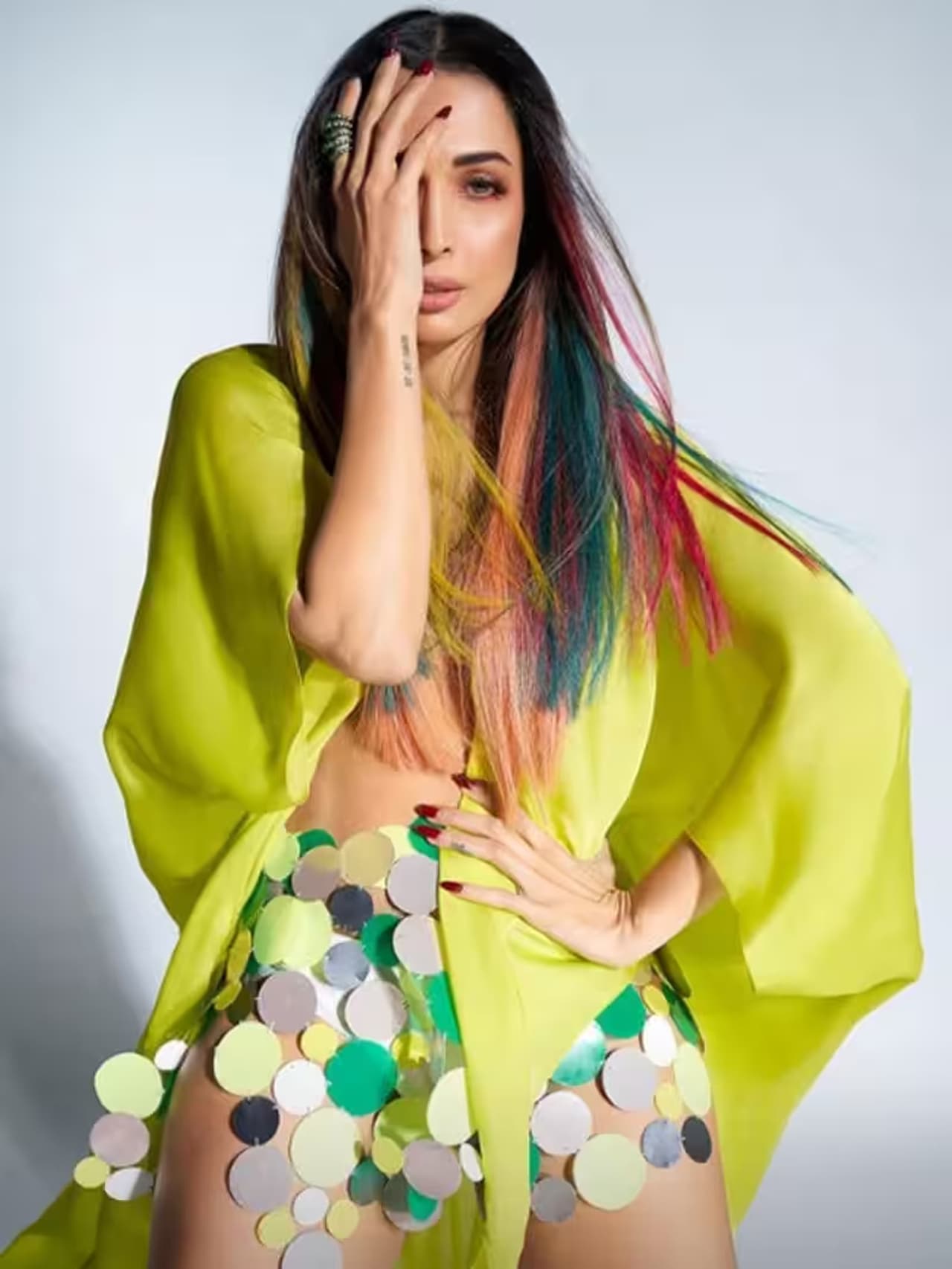 मलाइका के आउटफिट के बारे में ज्यादा बात करें तो ऊपर उन्होंने नियॉन कलर का श्रग पहना है, जो सामने साइड से ओपन है। वहीं, नीचे स्कर्ट की जगह अजीब सा आउटफिट पहना है, जो उनके लुक को और हॉट बना रहा है।