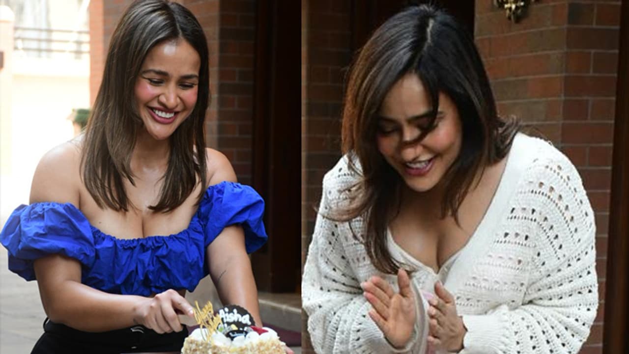 आयशा के साथ उनकी बड़ी बहन नेहा शर्मा भी थीं। आयशा ने केक काटा और पहले नेहा और फिर पैपराजी के लोगों को भी खिलाया।