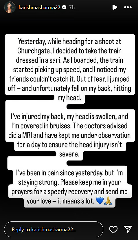 करिश्मा आगे लिखती है, "मेरी पीठ में चोट आई है और मेरा सिर भी सूज गया है। मेरे शरीर पर चोट के निशान हैं। डॉक्टर्स ने मुझे MRI की सलाह दी है। ताकि यह साफ़ हो सके कि सिर में गंभीर चोट तो नहीं आई है। मुझे अभी एक दिन की निगरानी में रखा गया है। मुझे कल से बहुत दर्द हो रहा है, लेकिन मैं स्ट्रॉन्ग बनी हुई हूं। प्लीज मेरी रिकवरी के लिए प्रार्थना करें और अपना प्यार देते रहें। मेरे लिए यह बेहद मायने रखता है।"