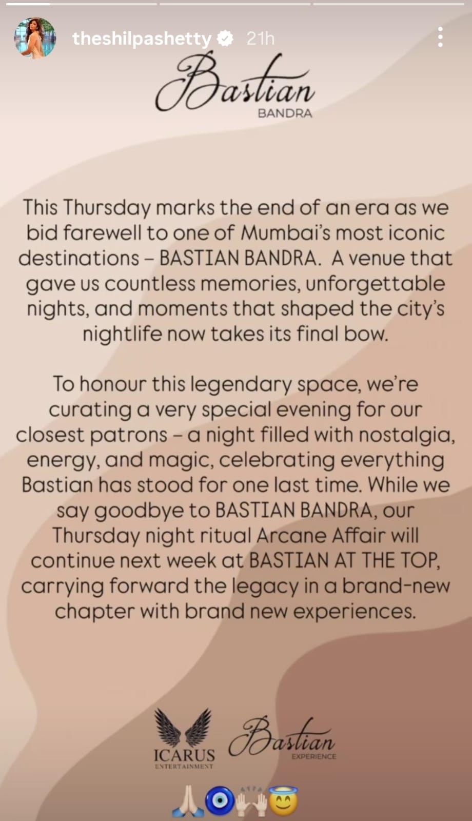 शिल्पा शेट्टी ने अपनी इंस्टाग्राम स्टोरीज पर एक नोट शेयर करते हुए अपने फैंस के साथ यह खबर शेयर करते हुए लिखा, 'इस गुरुवार को एक युग का अंत होने वाला है, क्योंकि हम मुंबई के सबसे आइकॉनिक डेस्टिनेशन में से एक, बास्टियन बांद्रा को अलविदा कह रहे हैं। यह एक ऐसी जगह है, जिसने हमें अनगिनत यादें दीं, नाइटलाइफ और ऐसे पल दिए जिन्होंने शहर की नाइटलाइफ को आकार दिया, लेकिन अब यह अपनी अंतिम विदाई कर रहा है। इस लेजेंड्री जगह को सम्मान देने के लिए, हम अपने सबसे करीबी पार्टनर्स के लिए एक बेहद खास शाम की प्लानिंग कर रहे हैं, पुरानी यादों, एनर्जी और जादू से भरी एक रात, जिसमें बास्टियन के साथ आखिरी बार जुड़ी हर चीज का जश्न मनाया जाएगा। बास्टियन बांद्रा को अलविदा कहने के साथ ही, हमारा गुरुवार रात का ये रिचुअल आर्केन अफेयर अगले हफ्ते बास्टियन एट द टॉप में जारी रहेगा, जो नए अनुभवों के साथ एक नए अध्याय में इस विरासत को आगे बढ़ाएगा।'