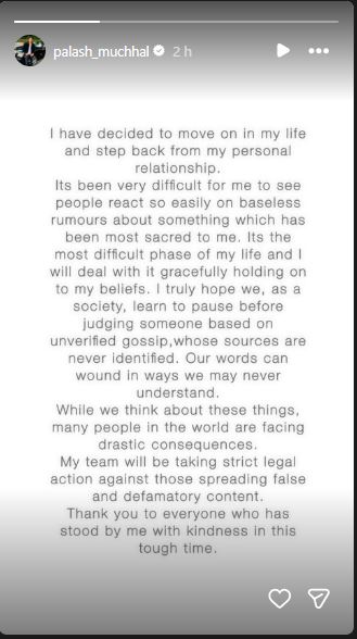 पलाश मुछाल ने अपनी स्टोरी में आगे लिखा है, "जब हम इन चीजों के बारे में सोचते हैं तो दुनिया के कई लोग इसके गंभीर नतीजों का सामना कर रहे हैं। झूठा और बदनाम करने वाला कंटेंट फैलाने वालों के खिलाफ मेरी टीम सख्त कानूनी कार्रवाई करेगी। इस मुश्किल वक्त में मेरे साथ खड़े रहने वाले सभी लोगों का शुक्रिया।"