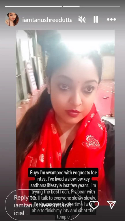 तनुश्री दत्ता ने अपनी ताजा इंस्टाग्राम स्टोरी में लिखा है, “साथियों, मैं इंटरव्यूज के लिए उपलब्ध नहीं हूं और मेरी तबियत भी ठीक नहीं है। मैं बीते कुछ सालों से शांत, साधना वाली जिंदगी जी रही हूं। मैं अपनी ओर से पूरी कोशिश कर रही हूं। कृपया धैर्य रखें। मैं सभी से धीरे-धीरे बात करूंगी। जब तक मैं इंटरव्यू पूरा कर मंदिर में बैठी, तब तक पूजा पूरी हो चुकी थी।”