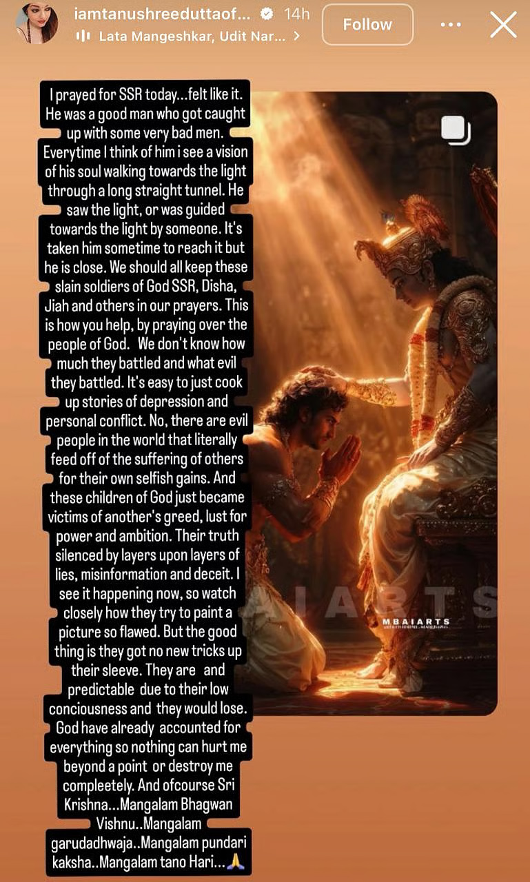 तनुश्री दत्ता ने अपनी इंस्टाग्राम स्टोरी पर सुशांत सिंह राजपूत को याद करते हुए लिखा है, "मैंने आज SSR के लिए प्रार्थना की...मुझे ऐसा ही लगा। वे अच्छे इंसान थे, जो कुछ बुरे लोगों के बीच फंस गए थे। जब भी मैं उनके बारे में सोचती हूं तो मुझे उनकी आत्मा का दृश्य दिखाई देता है, जो एक लंबी-सीधी सुरंग से होकर रोशनी की ओर बढ़ रही है। उन्हें रोशनी दिखी या किसी ने उन्हें रोशनी का रास्ता दिखाया। उन्हें पहुंचने में कुछ वक्त लगा, लेकिन वे करीब हैं।"