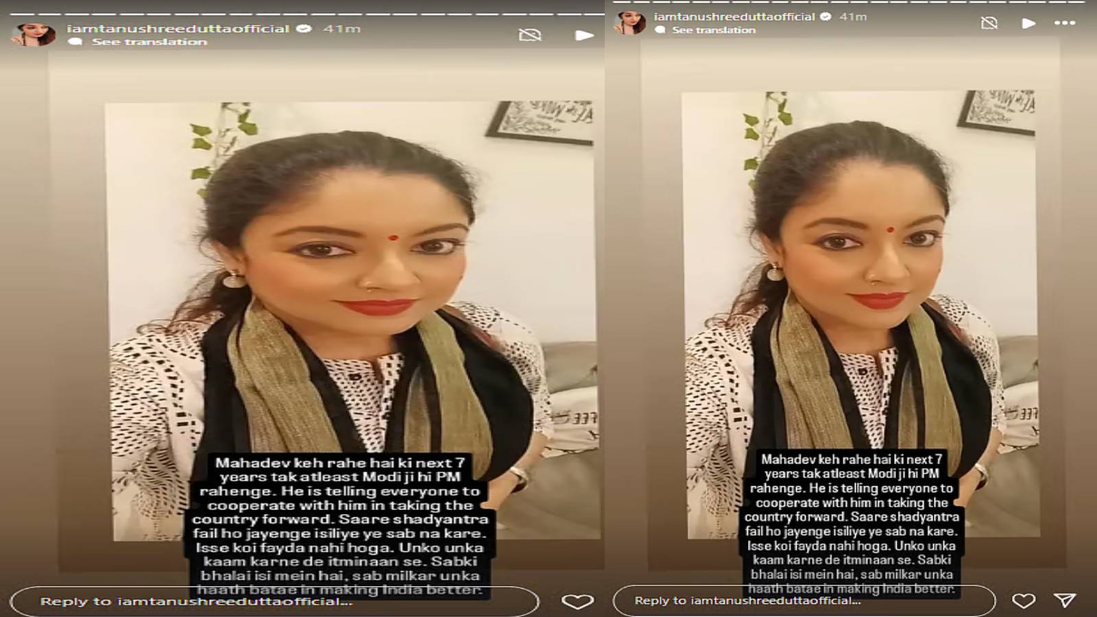Tanushree Dutta ने इंस्टाग्राम स्टोरी पर दावा किया कि 'महादेव' ने मोदी के अगले 7 साल तक प्रधानमंत्री रहने की भविष्यवाणी की है।उन्होंने सभी से मोदी का साथ देने की अपील की है। हाल ही में दत्ता ने अंजान लोगों पर उन्हें परेशान किए जाने के आरोप लगाए थे।
