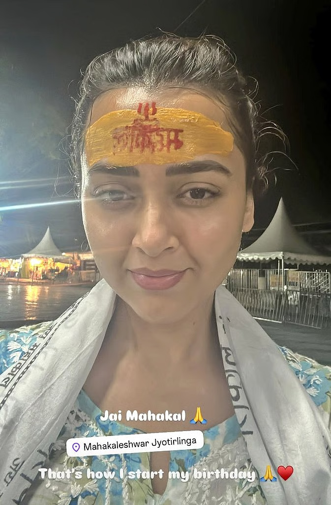 तेजस्वी ने सोशल मीडिया पर भी महाकाल दर्शन के बाद की अपनी तस्वीर शेयर की है। इसमें उन्हें माथे पर महाकाल का तिलक लगाए देखा जा सकता है। उनके चेहरे पर मुस्कान है। फोटो शेयर करते हुए तेजस्वी ने महाकालेश्वर ज्योतिर्लिंग को टैग किया है और कैप्शन में लिखा है, "जय महाकाल। मेरा जन्मदिन इस तरह शुरू हुआ।" बता दें कि तेजस्वी प्रकाश इन दिनों मध्य प्रदेश में अपने एक अपकमिंग प्रोजेक्ट की शूटिंग कर रही हैं।
