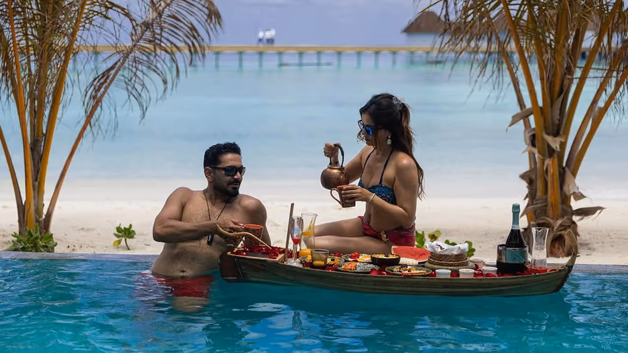 रुबीना दिलैक पति अभिनव शुक्ला के साथ पूल में दिखी। इस दौरान एक बड़ी सी फ्लोटिंग टेबल पर ब्रेकफास्ट आइटम्स भी दिखे।