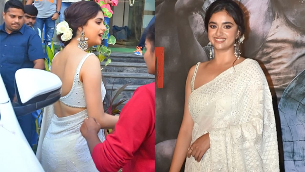 फिल्म की एक्ट्रेस कीर्ति सुरेश व्हाइट कलर की साड़ी में बेहद खूबसूरत लग रही थीं। कानों में बड़े-बड़े झुमके और बालों में सफेद गुलाब उनकी खूबसूरती में चार चांद लगा रहे थे।