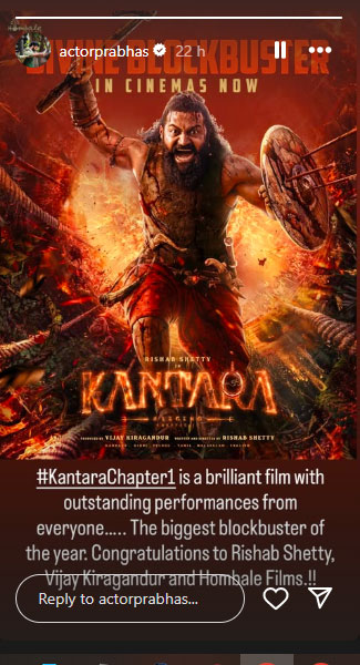 बाहुबली फ्रैंचाइज़ी, सलार, कल्कि 2898 एडी और कई हिट फिल्में देने वाले पैन इंडिया स्टार प्रभास लिखते हैं, "'कांतारा चैप्टर 1' शानदार फिल्म है, जिसमें सभी का परफॉर्मेंस आउटस्टैंडिंग है। यह साल की सबसे बड़ी ब्लॉकबस्टर फिल्म है। ऋषभ शेट्टी, विजय किरागंडूर और होम्बले फिल्म्स को बधाई!!”