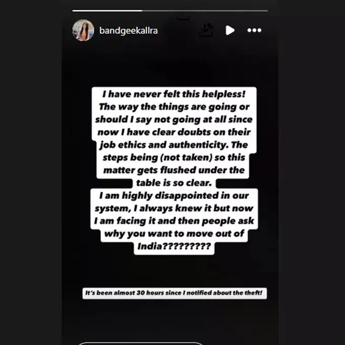 वहीं दूसरे पोस्ट में बंदगी ने लिखा, मैंने आज तक कभी भी इतना असहाय महसूस नहीं किया है। मैंने इस सिस्टम से बहुत डिस्पोइंट हूं। मुझे पता था कि ऐसा होता है, लेकिन अब मैं इसे फेस कर रही हूं। इसके बाद भी लोग पूछते हैं कि आप भारत से बाहर क्यों जाना चाहती हो। पुलिस को चोरी के बारे में सूचित किए हुए लगभग 30 घंटे हो चुके हैं, जिस तरह से चीजें चल रही हैं या नहीं चल रही हैं।'