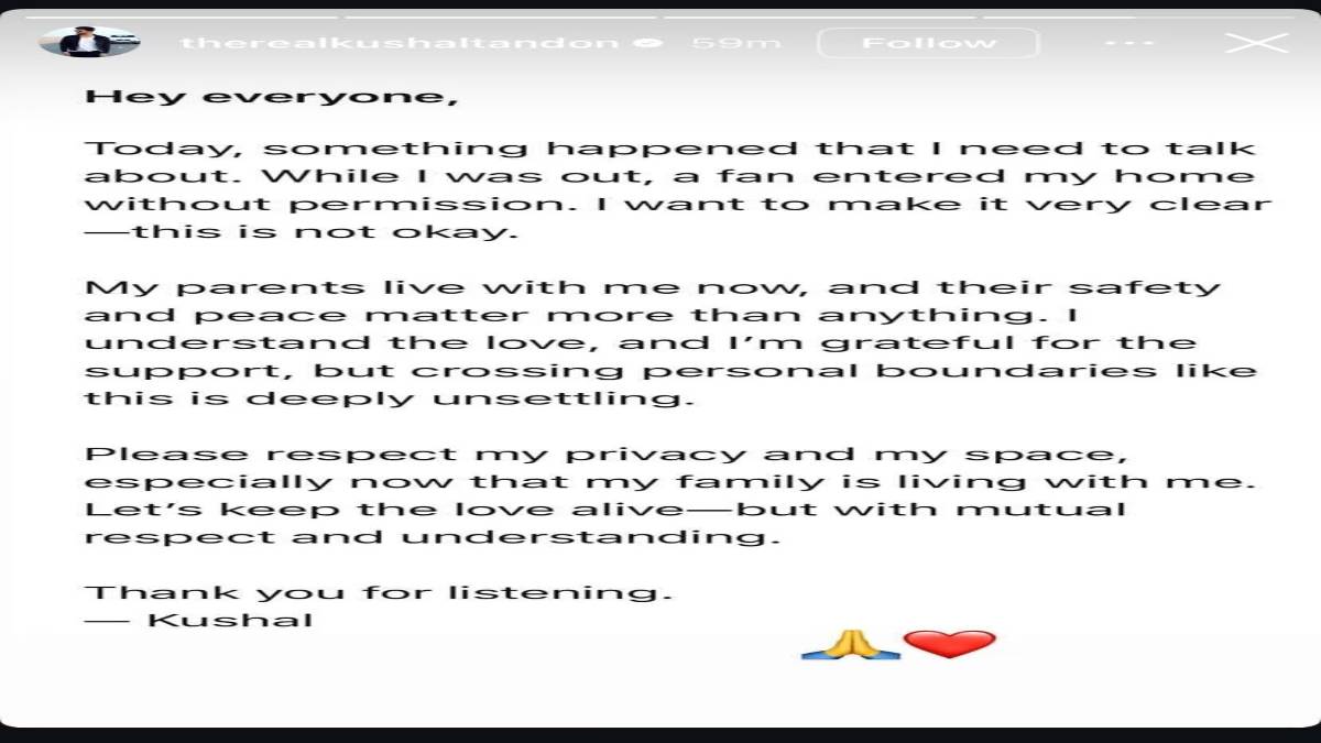 शनिवार को, कुशाल ने अपनी इंस्टाग्राम स्टोरीज़ पर लिखा, “सभी को Hello, आज कुछ ऐसा हुआ जिसके बारे में मुझे बात करनी है। जब मैं बाहर था, एक फैन बिना अनुमति के मेरे घर में घुस आया। मैं यह साफ कर देना चाहता हूँ कि यह ठीक नहीं है। मेरे पेरेंट्स अब मेरे साथ रहते हैं, और उनकी सेफ्टी और शांति किसी भी चीज़ से ज़्यादा मायने रखती है। मैं फैंस के प्यार को समझता हूं, और मैं उनके सपोर्ट के लिए आभारी हूं, लेकिन इस तरह की सीमाएं लांघना करना बेहद परेशान करने वाला है।” उन्होंने आगे लिखा, "प्लीज मेरी प्रायवेसी और मेरे स्पेस का सम्मान करें, खासकर अब जब मेरी फैमिली मेरे साथ रह रही है। आइए प्यार को ज़िंदा रखें - लेकिन आपसी सम्मान और समझ के साथ। ध्यान देन के लिए थैंक्स।"