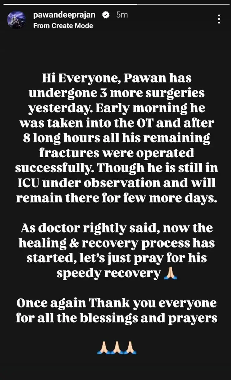 पवनदीप की टीम ने सोशल मीडिया पर शेयर किया बयान, 'हलो दोस्तों, पवन की कल तीन और सर्जरी हुईं। सुबह-सुबह उन्हें ओटी में ले जाया गया और 8 घंटे तक उनकी सर्जरी चली। इस दौरान उनके बचे हुए फ्रैक्चर का सफलतापूर्वक ऑपरेशन किया गया। हालांकि वह अभी भी आईसीयू में निगरानी में हैं और उन्हें कुछ और दिन वहीं रहना होगा। जैसा कि डॉक्टर ने सही कहा, अब हीलिंग और रिकवरी प्रोसेस शुरू हो चुका है। आइए हम उनके जल्द स्वस्थ होने की प्रार्थना करें। एक बार फिर, सभी की दुआओं और प्रार्थनाओं के लिए आप सभी का धन्यवाद।'
