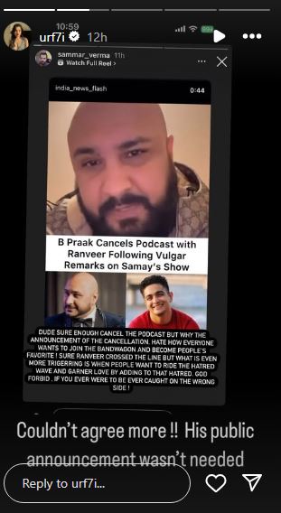 उर्फी जावेद ने सोशल मीडिया के जरिए सिंगर बी-प्राक भी घेरा है, जिन्होंने रणवीर इलाहादिया के विवादित कमेंट के बाद उनके साथ पॉडकास्ट कैंसिल करने की घोषणा की। उर्फी ने उन्हें निशाने पर लेते हुए लिखा है, "यार पॉडकास्ट कैंसिल करने तक ठीक था। लेकिन इसका अनाउंसमेंट क्यों किया गया। हर कोई बहती गंगा में हाथ धोना चाहता है और लोगों का चहेता बनना चाहता है। जाहिरतौर पर रणवीर ने हद पार की, लेकिन इससे भी बड़ा रोना यह है कि लोग नफरत की लहर पर सवार होकर प्यार पाना चाहते हैं। भगवान ना करे, कभी आप कुछ गलत करते पकड़े गए थे।"