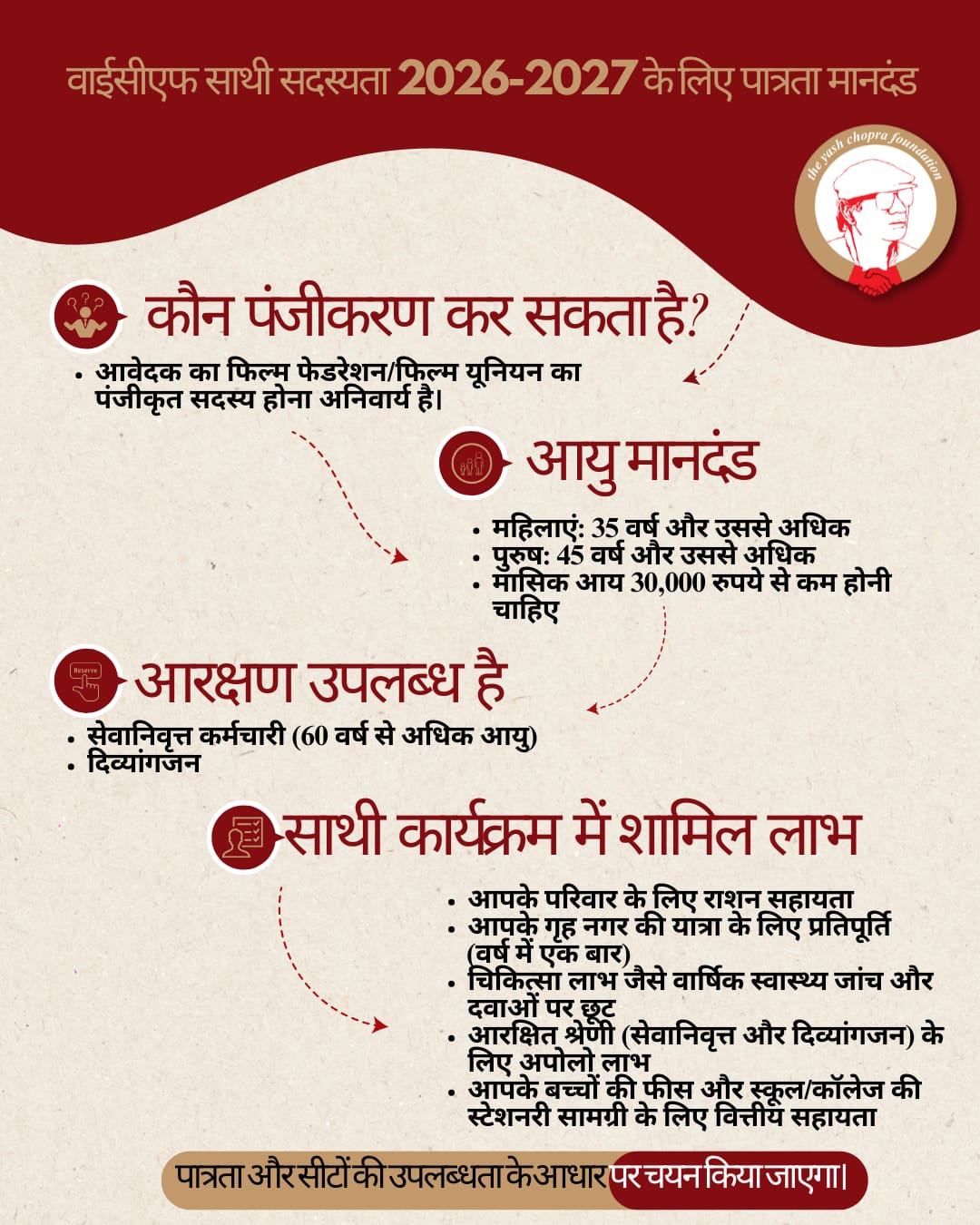 ‘साथी प्रोग्राम 2026’ में 60 वर्ष और उससे अधिक आयु के सेवानिवृत्त फिल्म कर्मियों और दिव्यांग व्यक्तियों को विशेष प्राथमिकता दी गई है। फाउंडेशन यह मानता है कि इन वर्गों की स्वास्थ्य संबंधी जरूरतें अधिक होती हैं और आय के अवसर सीमित रहते हैं। इसलिए उन्हें अतिरिक्त और निरंतर सहयोग प्रदान करने पर विशेष ध्यान दिया गया है।