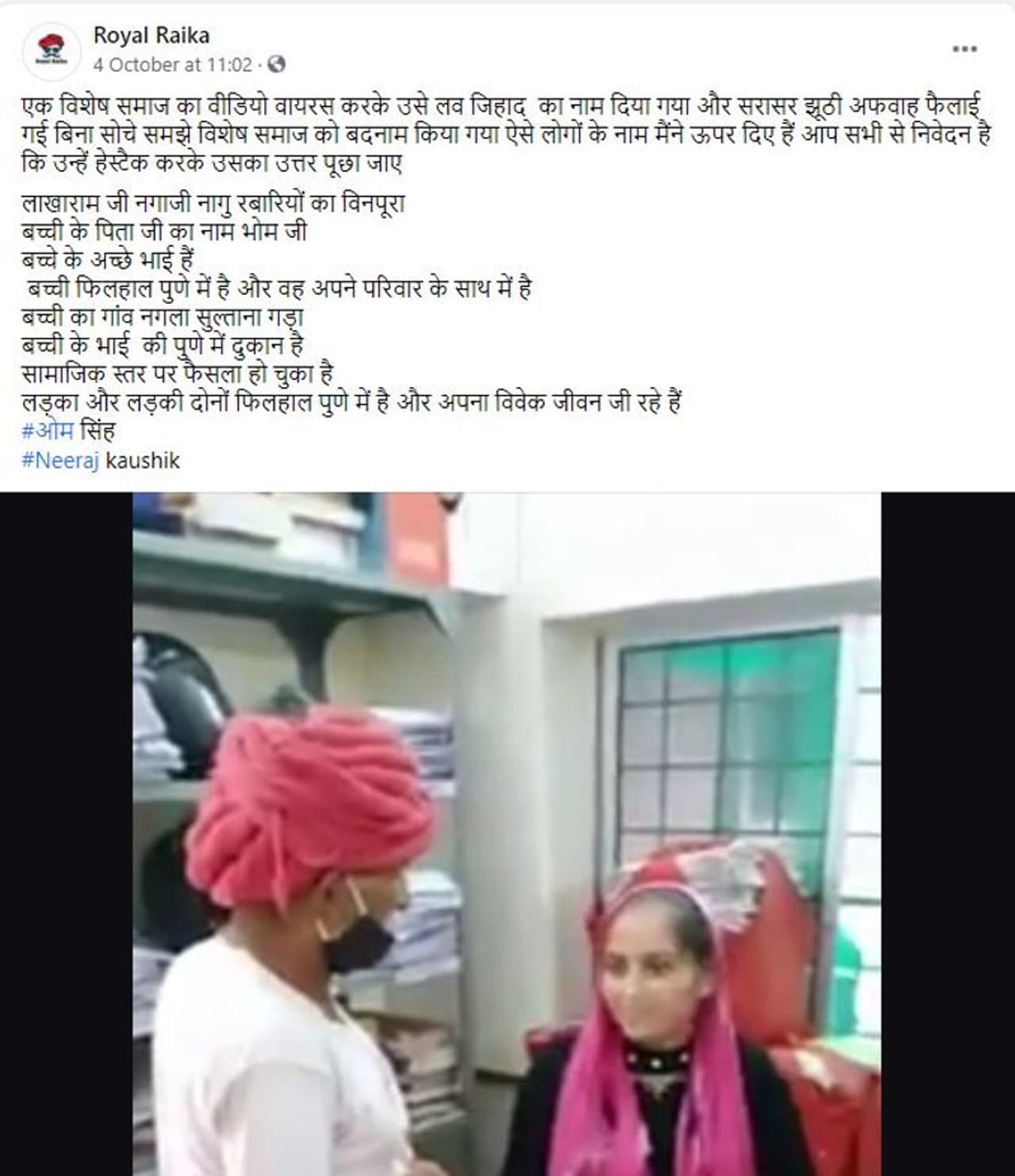 अपनी पड़ताल के दौरान हमने पाया कि ‘रॉयल रायका’ नामक एक फ़ेसबुक पेज ने 3 अक्टूबर को एक लाइव वीडियो और 4 अक्टूबर के एक पोस्ट में इस वीडियो की जानकारी दी थी और ‘लव-जिहाद’ के मामले को ग़लत बताया था। उन्होंने दावा किया कि एक विशेष समाज को बदनाम करने के लिए अफ़वाह फैलाई जा रही है। हमने इस पेज से संपर्क किया। पेज के एडमिन ने हमें बताया कि शादी करने वाले दोनों पक्ष हमारी कम्युनिटी (रबाड़ी) के हैं और सोशल मीडिया पर किया जा रहा दावा सरासर ग़लत है। यहां हम आपको बता दें कि रबाड़ी राजस्थान की एक कम्युनिटी है।