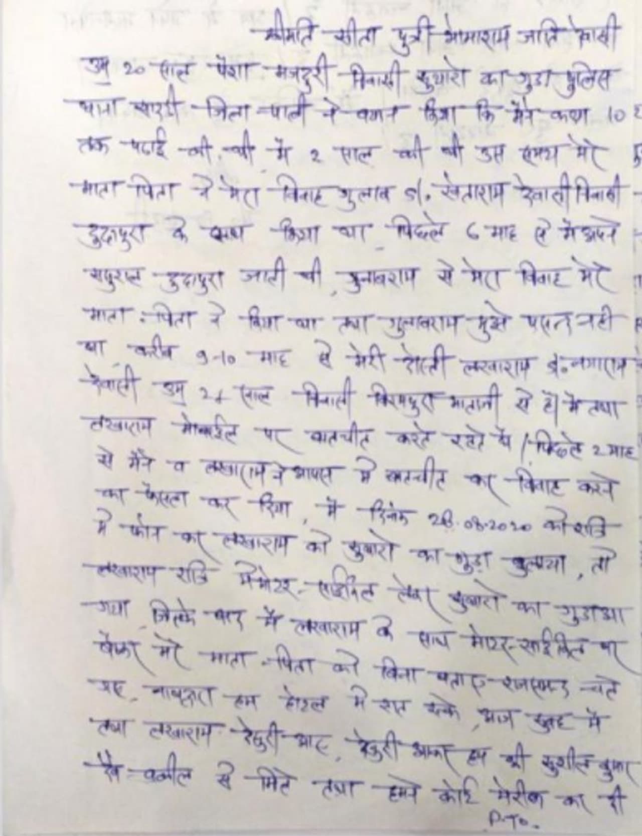 ASP ने हमें सीता का लिखित बयान भी भेजा। बयान के मुताबिक, वो जब दो साल की थी तो उसके मां-बाप ने उसकी शादी गुलाब देवासी से करवा दी थी। लेकिन उसे गुलाब पसंद नहीं था। करीब 1 साल पहले उसकी दोस्ती लखाराम से हुई. दोनों की फ़ोन पे बातचीत होती थी। 2 महीने पहले दोनों ने शादी करने का फैसला किया। 28 अगस्त को वो लखाराम के साथ अपने घरवालों को बिना बताये चली गयी। उसके बाद उन्होंने एक वकील से मिलकर कोर्ट में शादी कर ली। उसने अपने बयान में लिखा है कि वो बालिग है और लखाराम के साथ ही रहना चाहती है।