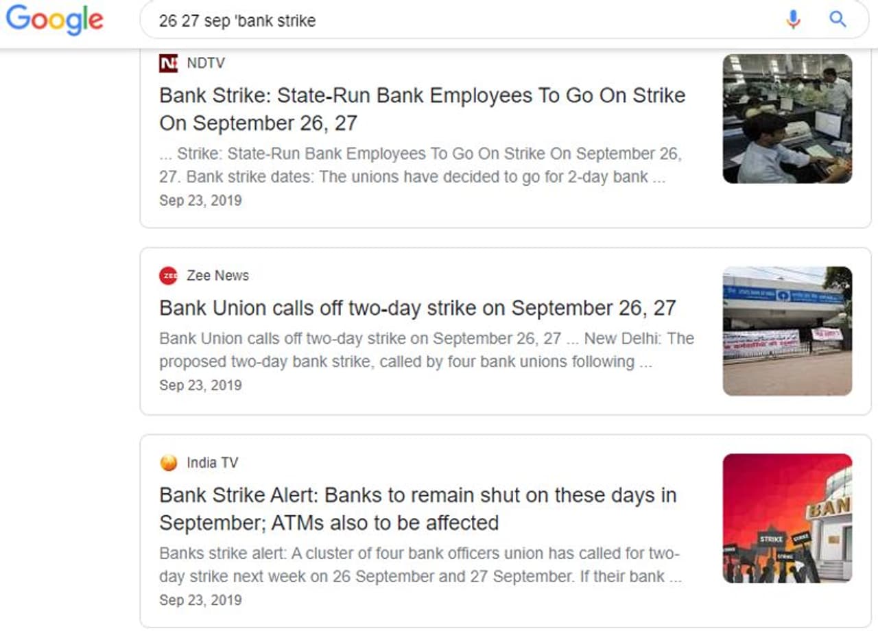 सबसे पहले जरूरी कीवर्ड्स (26, 27 september bank strike) की मदद से इस वायरल दावे को इंटरनेट पर सर्च किया। हमें हालिया ऐसी कोई प्रामाणिक न्यूज़ रिपोर्ट नहीं मिली, जो इस दावे की पुष्टि करती हो। इसकी जगह पर हमें पिछले साल की न्यूज़ रिपोर्ट मिलीं, जिनमें 26, 27 सितंबर 2019 को बैंक हड़ताल का जिक्र है।