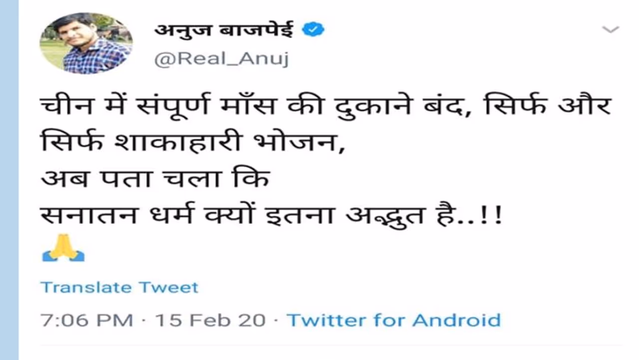 कोरोना वायरसर लगातार ट्रेंड में है। लोग इसके बारे में बात कर रहे हैं। ट्विटर पर अनुज बाजपेयी नाम के एक शख्स ने लिखा कि, चीन मांस की सभी दुकाने बंद हैं और शाकाहार को अपानाया जा रहा है, इससे सनातन धर्म की ताकत का अंदाजा लगाया जा सकता है।