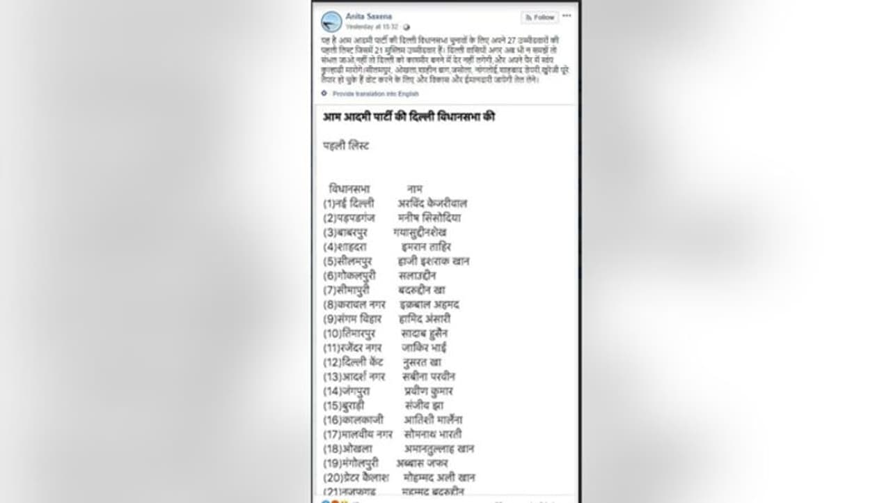 कई फेसबुक यूजर ने इस लिस्ट को पोस्ट करते हुए लिखा, 'यह है आम आदमी पार्टी की दिल्ली विधानसभा चुनावों के लिए अपने 27 उम्मीदवारों की पहली लिस्ट, जिसमें 21 मुस्लिम उम्मीदवार हैं। दिल्लीवासियों....अगर अब भी न समझें तो संभल जाओ, नहीं तो दिल्ली को काश्मीर बनने में देर नहीं लगेगी और आप अपने पैर में स्वयं कुल्हाड़ी मारोगे।'