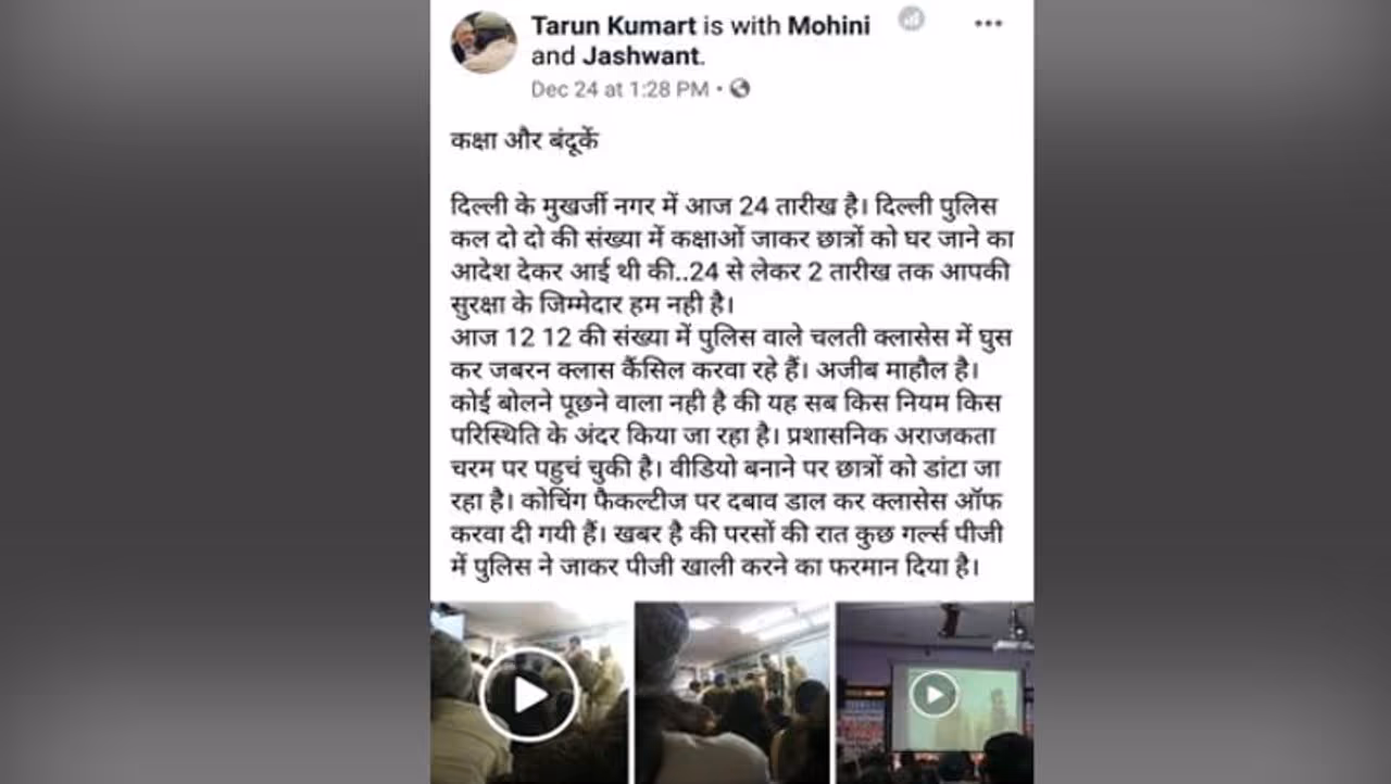 वायरल पोस्ट में दावा किया जा रहा है कि पुलिस कोचिंग सेंटर्स के क्लासरूम में घुस रही है, उन्हें खाली करवा रही है और स्टूडेंट्स को अपनी टिकट करवाकर घर जाने को कह रही है। हालांकि दिल्ली पुलिस ने वायरल पोस्ट पर पूरी सच्चाई खोल दी।