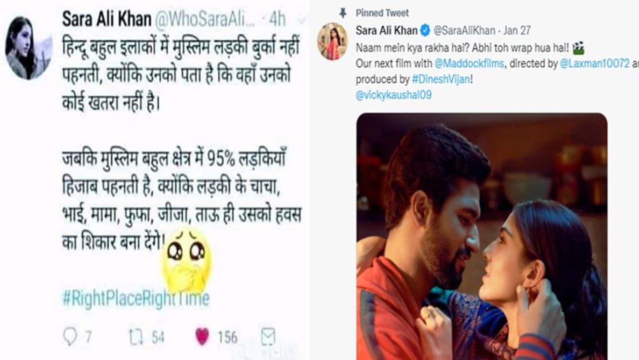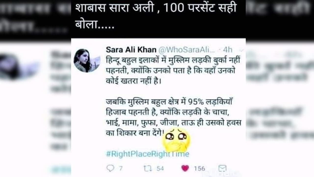 कई सोशल मीडिया यूजर्स ने “@WhoSaraAli” हैंडल से ट्वीट के कथित स्क्रीनशॉट को शेयर किया, जो तेजी से वायरल हो रहा है। जिसमें लिखा गया है कि "हिंदू बहुल इलाकों में मुस्लिम लड़कियां बुर्का नहीं पहनती हैं क्योंकि उनको पता है कि वहां उनको कोई खतरा नहीं हैं। जबकि, मुस्लिम बहुल क्षेत्र में है 95 प्रतिशत लड़कियां हिजाब पहनती हैं क्योंकि लड़की के चाचा, भाई, मामा, फुफा, जीजा, ताऊ ही उसको हवस का शिकार बना देंगे।”
