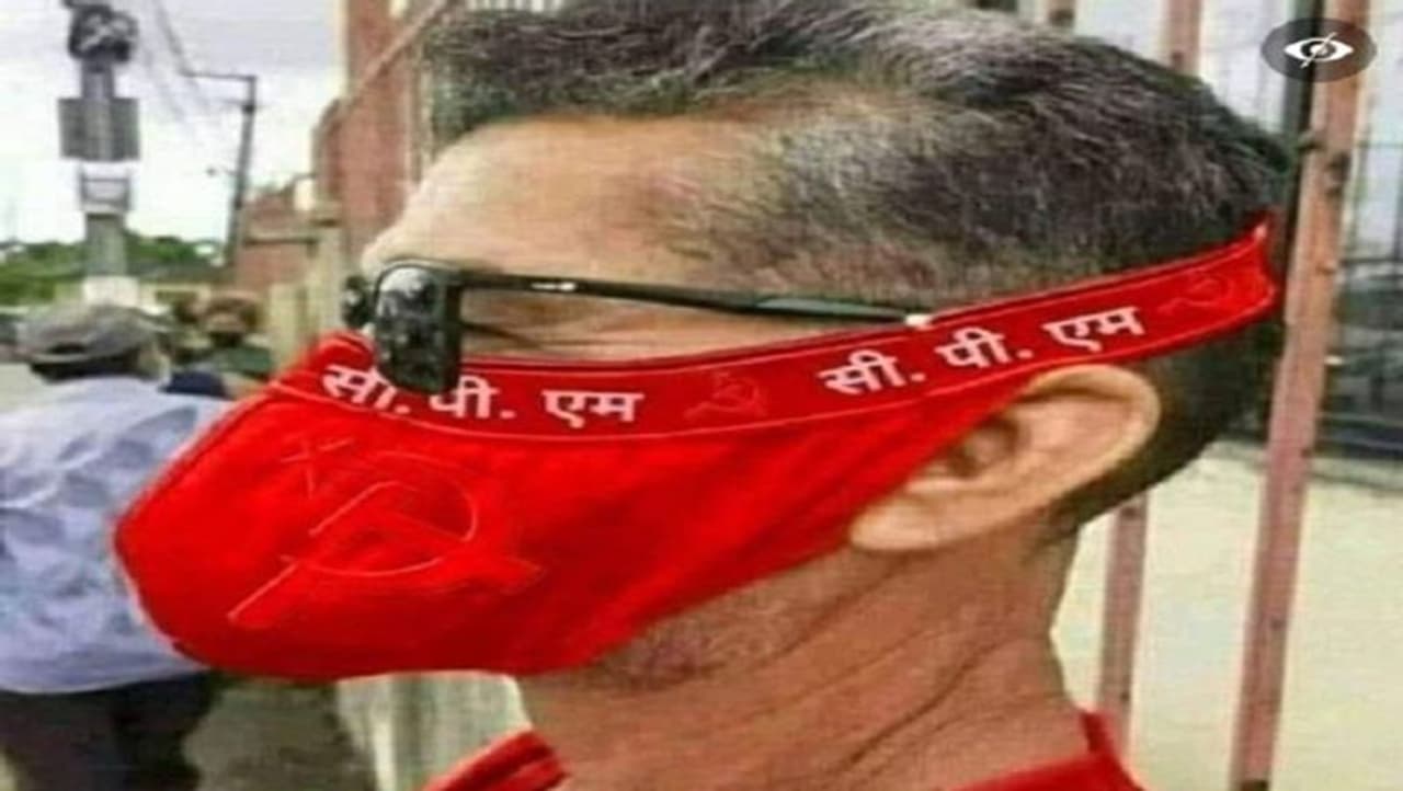 सोशल मीडिया कम्युनिस्ट मास्क बोलकर वायरल की जा रही तस्वीर फर्जी है। इस फोटो में जान पूछकर सीपीएम पार्टी का नाम और उसका लोगो बनाया गया है।