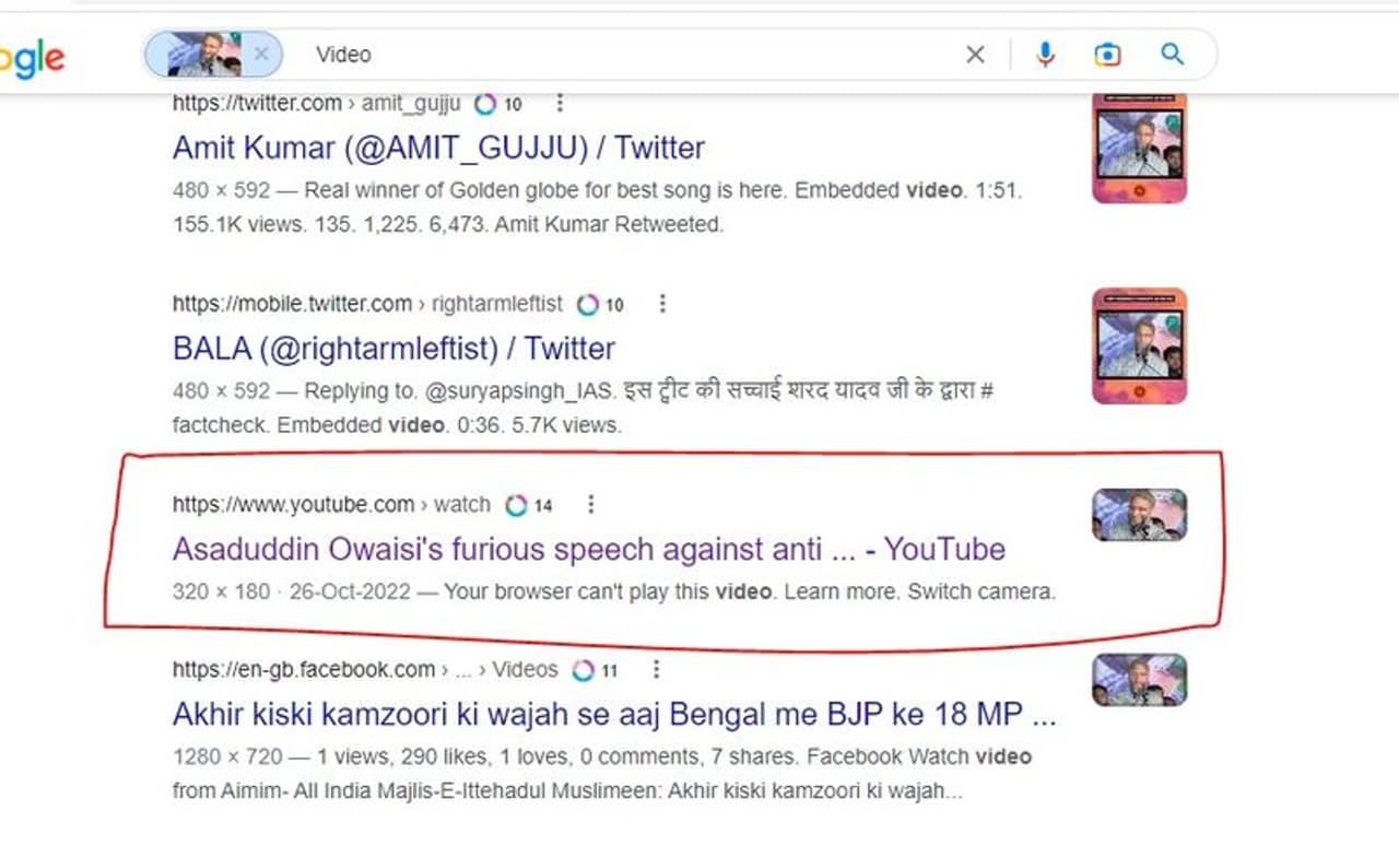 पड़ताल का स्टेप नंबर 1: वीडियो का सच जानने के लिए हमने सबसे पहले गूगल रिवर्स इमेज की मदद ली। हमने स्निपिंग टूल की मदद से वीडियो से ओवैसी की इमेज को क्रॉप किया। इसके बाद हमने गूगल में ओवैसी की फोटो को अपलोड किया। गूगल इंडेक्स के पहले ही पेज पर हमें यूट्यूब की एक लिंक मिली।