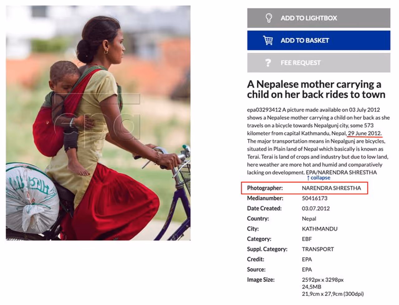 एक अखबार की 19 मई की एक फ़ैक्ट-चेक रिपोर्ट में इस तस्वीर के यूरोपियन प्रेस फ़ोटो एजेंसी में उपलब्ध होने की बात बताई गई है। फ़ोटो एजेंसी द्वारा दी गई डीटेल के मुताबिक, इस तस्वीर को नरेंद्र श्रेष्ठा ने 29 जून 2012 को खींचा था। कैप्शन में बताया गया है कि एक नेपालियन महिला ने अपने बच्चे को पीठ पर बांधकर राजधानी काठमांडू से करीब 573 किलोमीटर दूर नेपालगंज तक सफ़र किया।