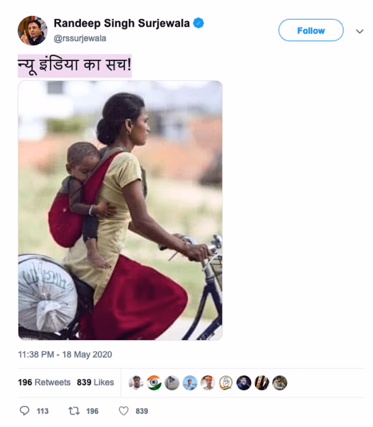 कांग्रेस के प्रवक्ता रणदीप सिंह सुरजेवाला ने 18 मई को अपने ट्विटर हैंडल से एक पोस्ट की। इस पोस्ट में सुरजेवाला ने एक महिला की साइकिल चलाते हुए शेयर की। इसमें उसकी पीठ पर एक बच्चा बंधा हुआ और है साइकिल के पीछे एक बोरी बंधी हुई है । सुरजेवाला ने ये तस्वीर उस वक़्त शेयर की जब देश में लॉकडाउन की वजह से लाखों प्रवासी मज़दूर अपने राज्य वापस जाने के लिए पैदल ही सफ़र तय कर रहे हैं।