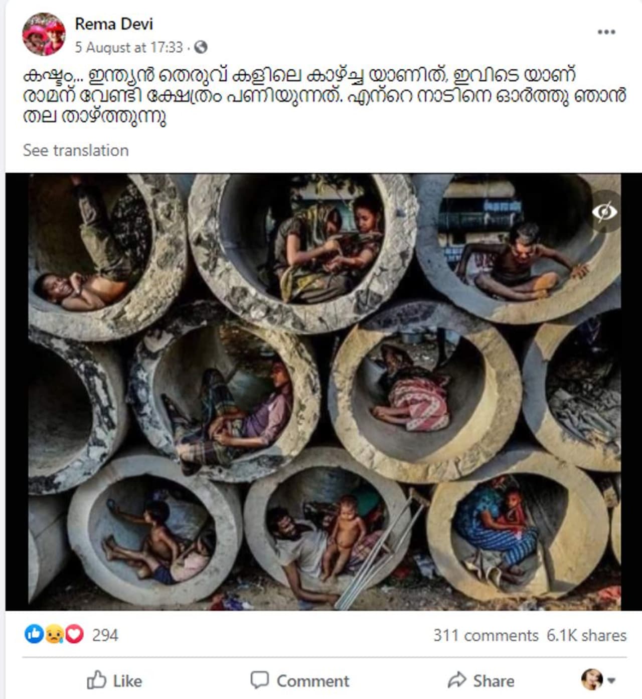 फेसबुक पर वायरल इस पोस्ट में 1 तस्वीर है जिसमें बड़े-बड़े सीवर के पाइपों के अंदर रहने वाले वाले लोगों को देखा जा सकता है। जिसका हिंदी अनुवाद होता है “यह उसी भारत देखा की सड़कों का दृश्य है, जहां राम के लिए भव्य मंदिर बनाया जा रहा है।”