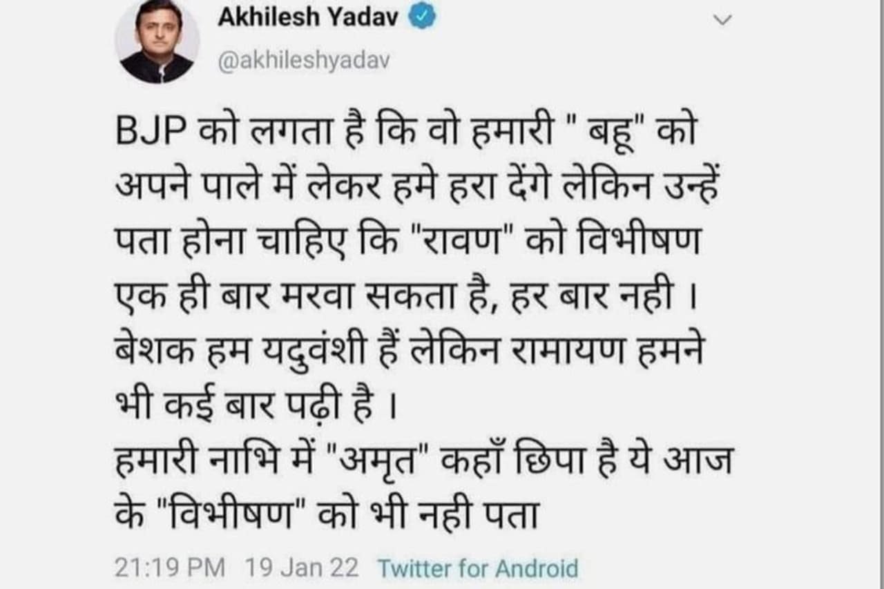 सोशल मीडिया में अखिलेश यादव का एक स्क्रीनशॉट वायरल हो रहा है जिसमें लिखा है, “BJP को लगता है कि वो हमारी ‘बहू’ को अपने पाले में लेकर हमे हरा देंगे लेकिन उन्हें पता होना चाहिए कि ‘रावण’ को विभीषण एक ही बार मरवा सकता है, हर बार नहीं। बेशक हम यदुवंशी हैं लेकिन रामायण हमने भी कई बार पढ़ी है। हमारी नाभि में अमृत कहां छिपा है ये आज के ‘विभीषण’ को भी नही पता।” इस ट्वीट में 19 जनवरी, 2022 तारीख भी लिखी है।