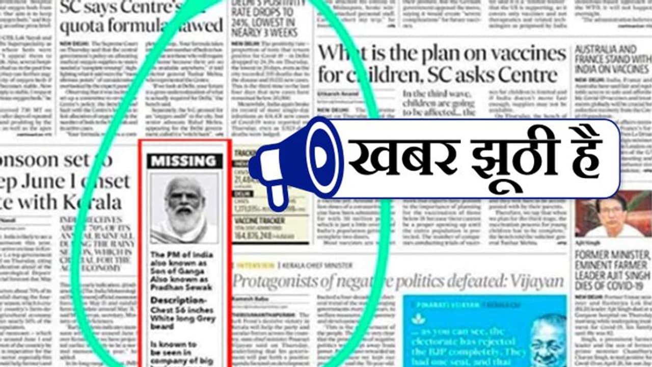 अखबार में 'मिसिंग' का विज्ञापन जिसे वायरल किया जा रहा है वह एडिट किया हुआ है। फेसबुक और ट्विटर यूजर्स जिसे वायरल कर रहे हैं वो पूरी तरह से फेक है। न्यूज पेपर में पीएम मोदी के मिसिंग का कोई एड नहीं पब्लिश किया गया है। यह पूरी तरह से वायरल है।