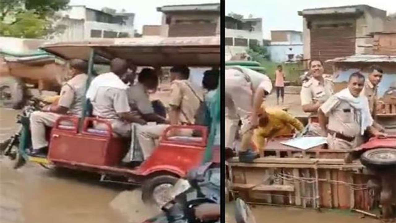 सड़क पानी में डूबी हुई है, कहीं कुछ भी नजर नहीं रहा है। इस दौरान ऑटो रिक्शा का एक टायर एक गढ्ढ़े में पड़ता हैं और ऑटो रिक्शा पलट जाता है। सभी पुलिस कर्मी इस सड़क पर ऑटो समेत पलट जाते हैं। कुछ लोग आसपास से गुजर रहे हैं, वहीं किसी ने इसका वीडियो बना लिया।